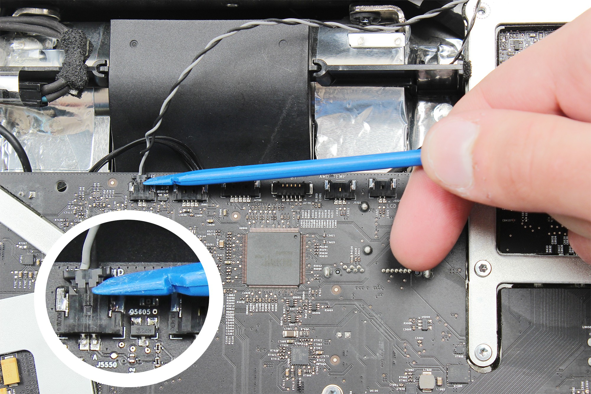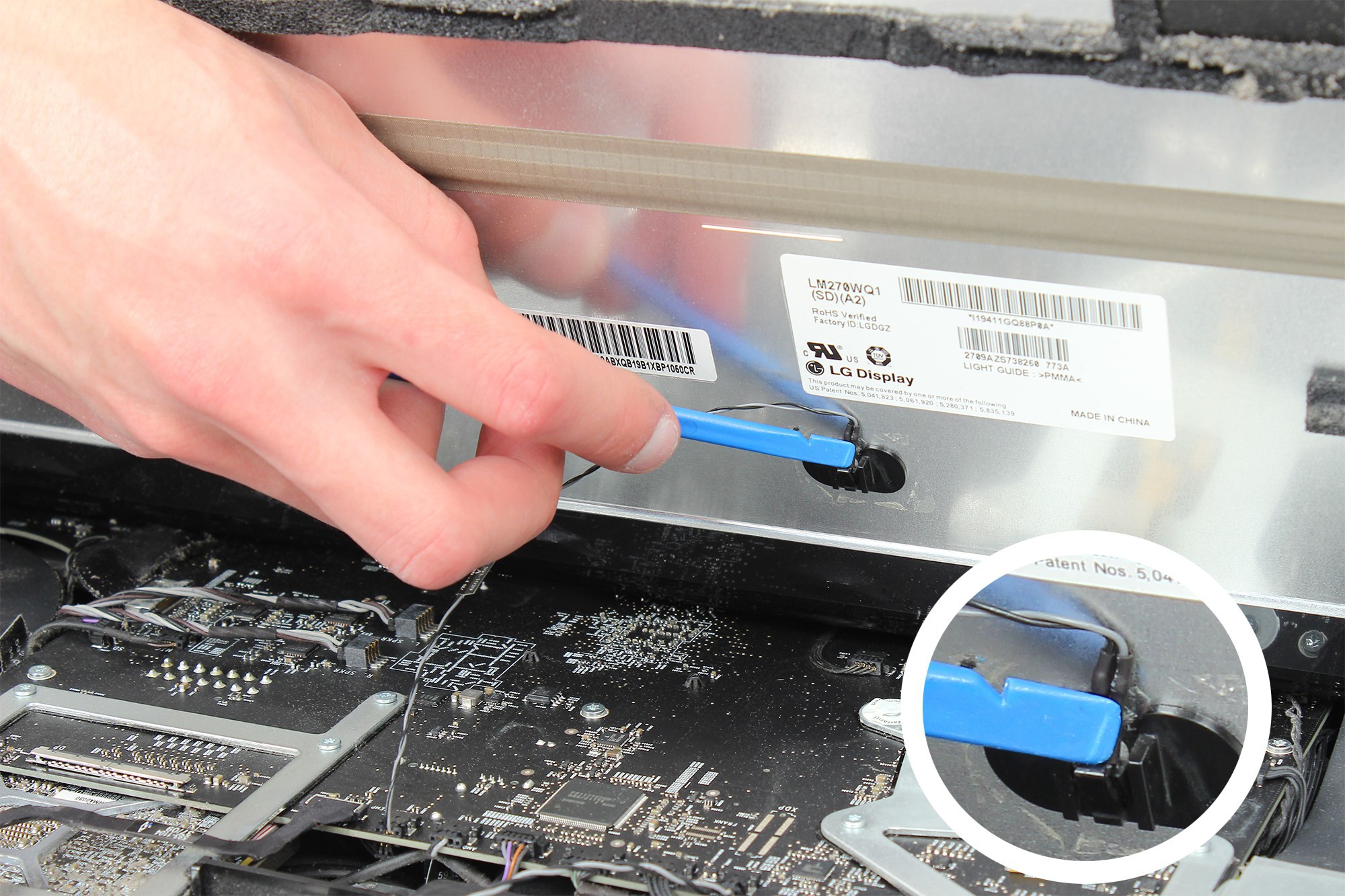 Appuyez légèrement sur le câble noir d'alimentation de l'écran LCD afin de le déclipser.