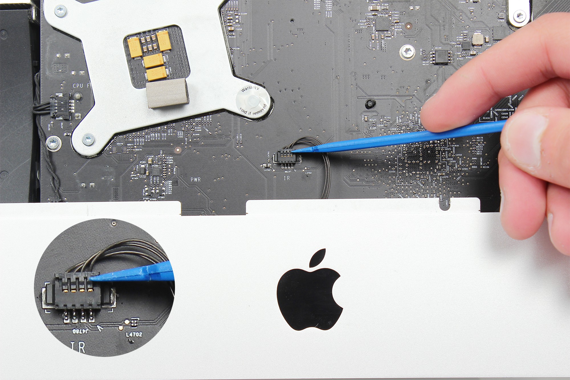 A l'aide d'une spatule en nylon, déconnectez le câble du récepteur infrarouge de la carte mère.