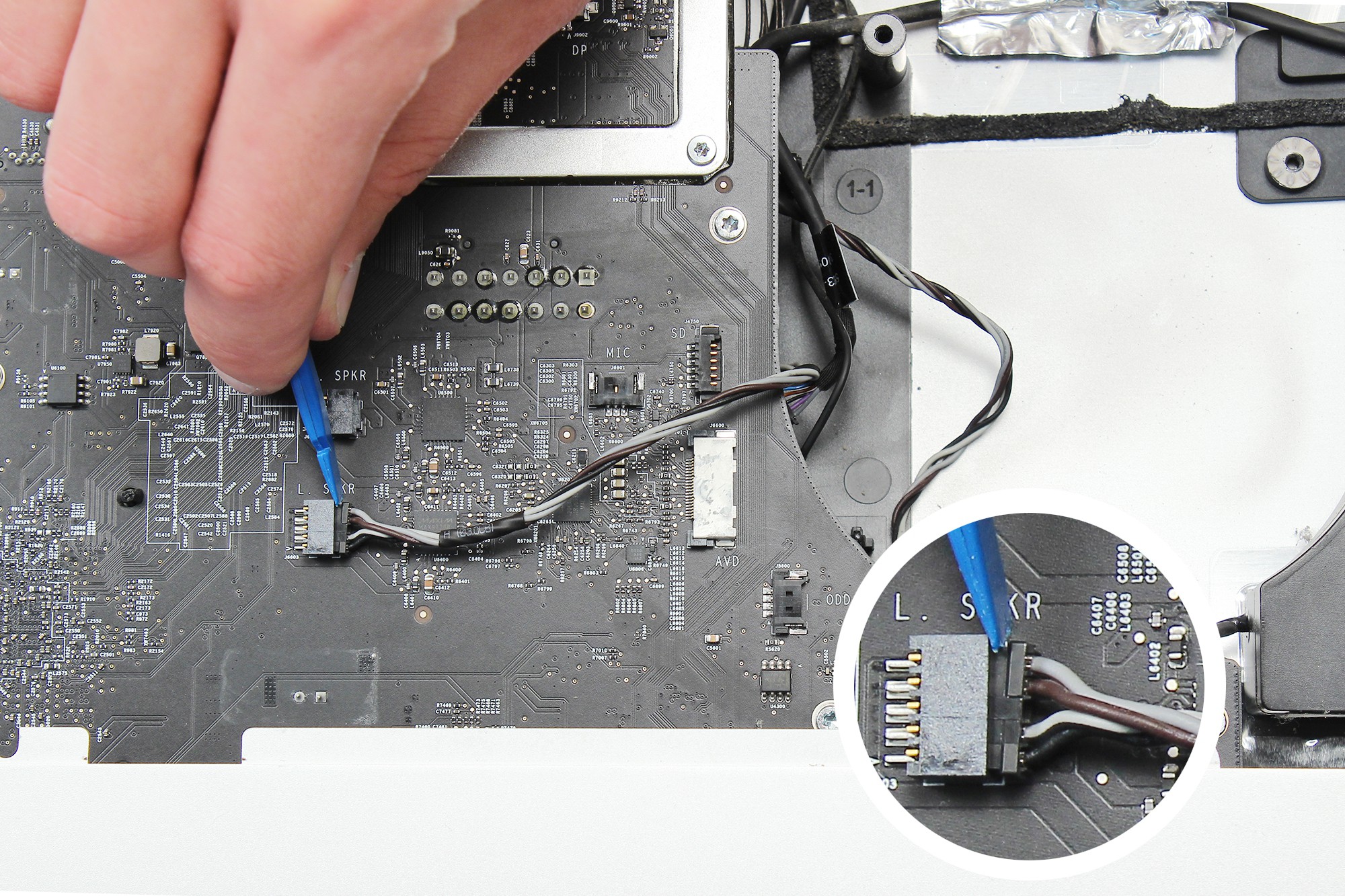 Répétez la même opération avec le câble du haut parleur gauche à l'aide de la spatule en nylon.