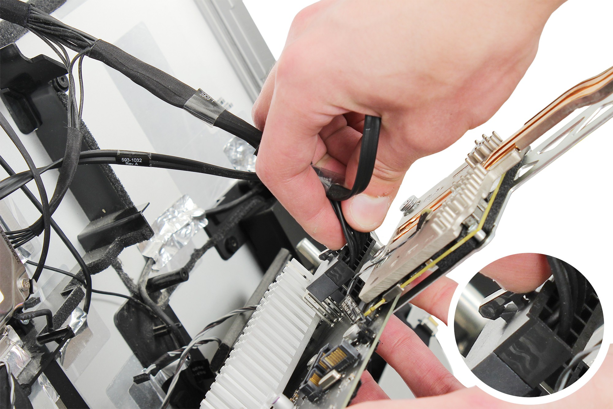 Note : Ce câble est clipsé. Appuyez sur l'élement plastique de verrouillage sur le dessus puis tirez le câble vers vous délicatement afin de le déclipser.