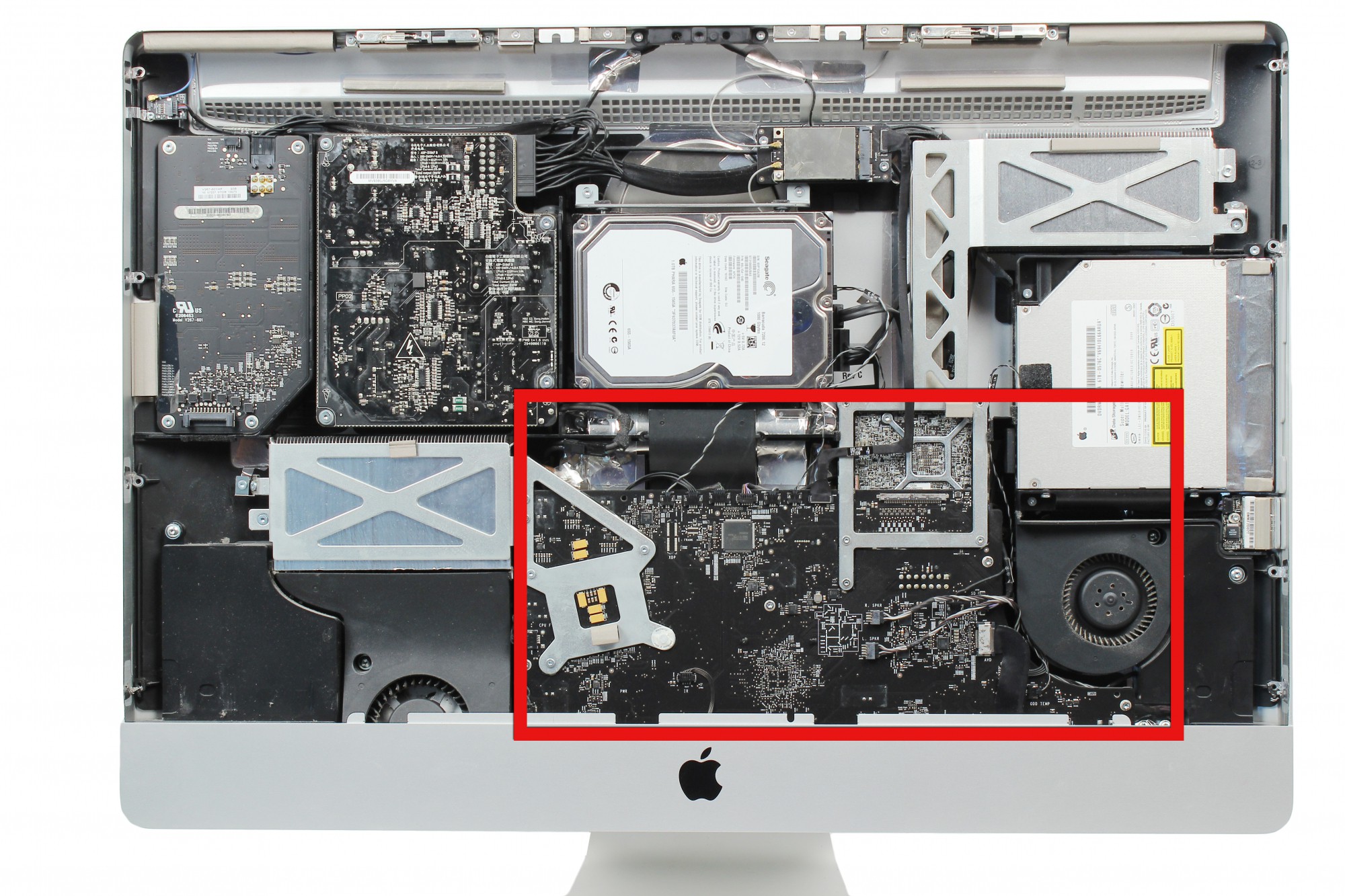 La carte mère de l'iMac est localisée au centre droit comme indiqué sur la photo.