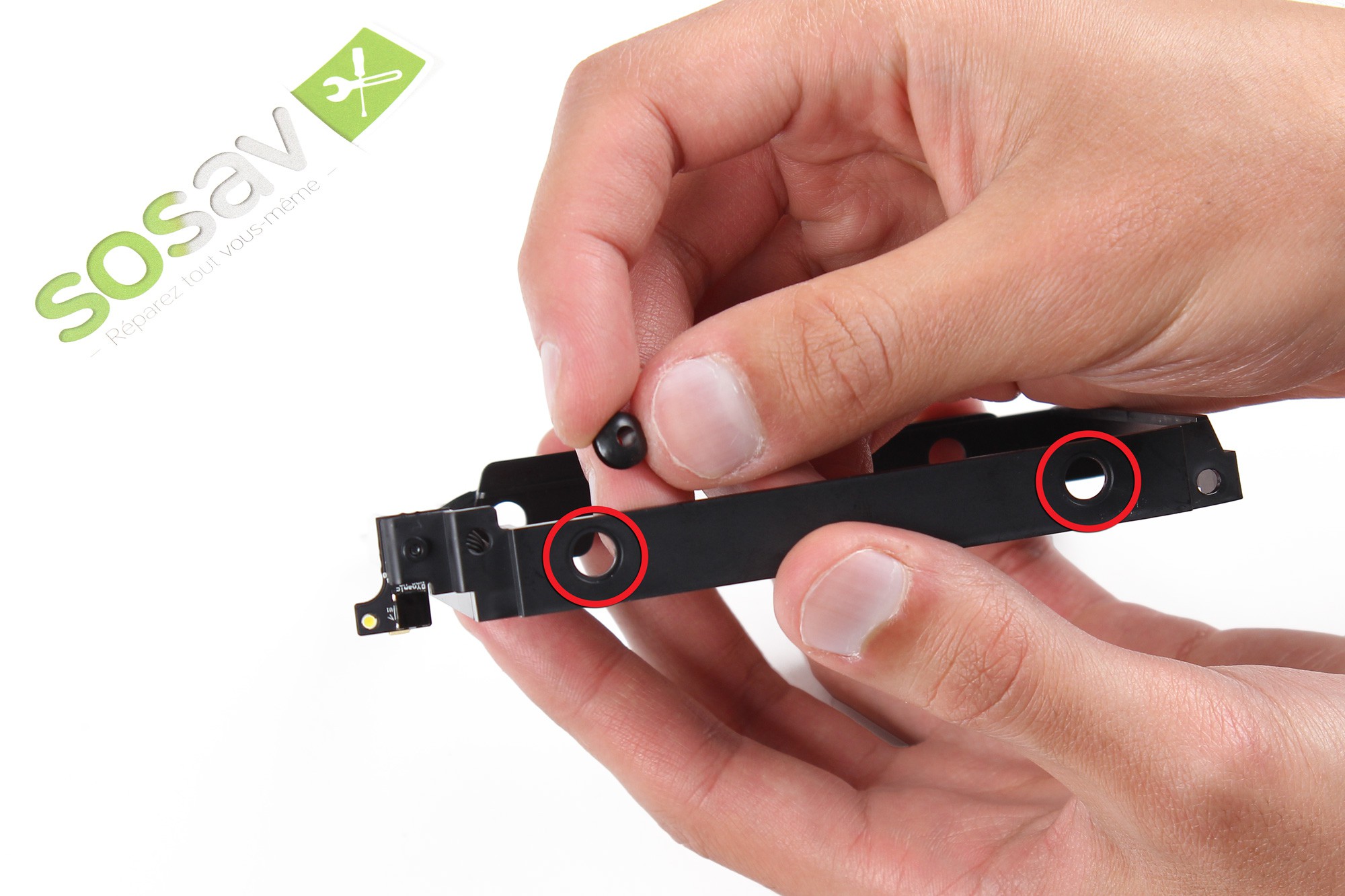 Prenez le support du côté ou est placé le récepteur puis installez les caoutchoucs de maintien du disque dur à l'intérieur des deux trous prévus à cet effet.