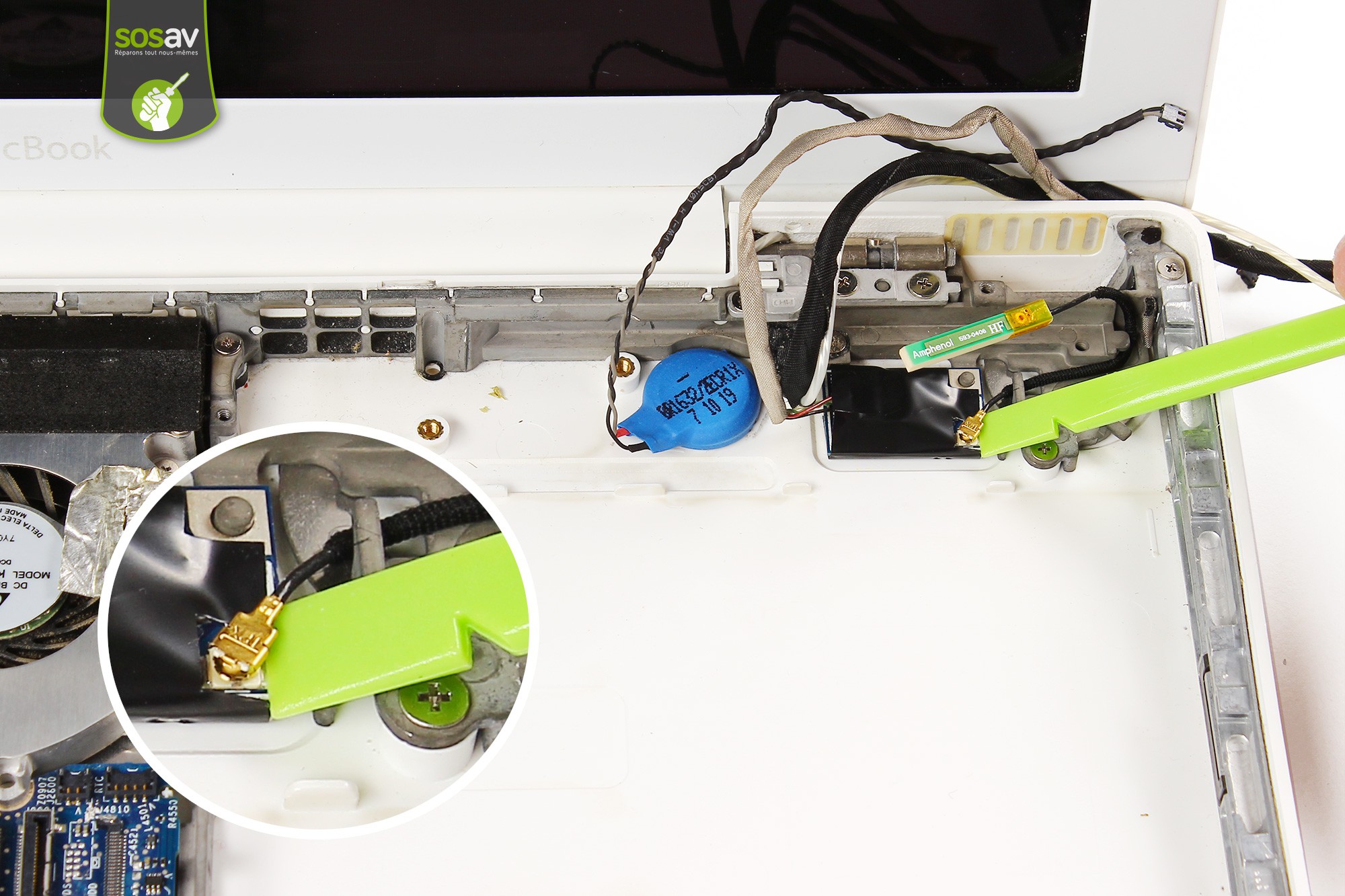 A l'aide de la spatule en nylon, décollez délicatement l'antenne Bluetooth de son support.