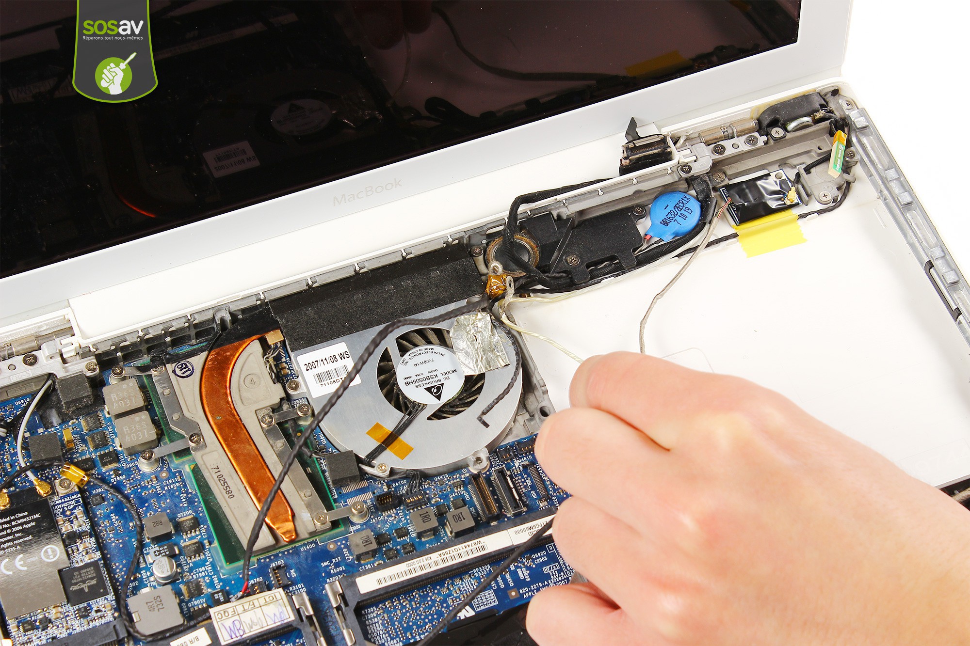 Reprenez la spatule en nylon afin de déconnecter délicatement le connecteur du haut-parleur central et haut-parleur droit.