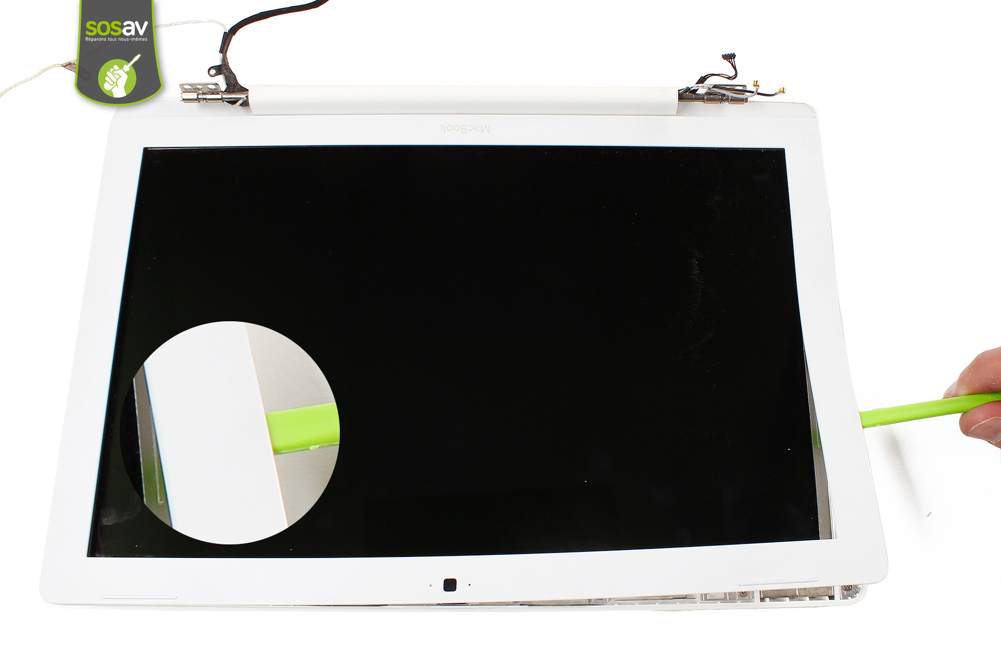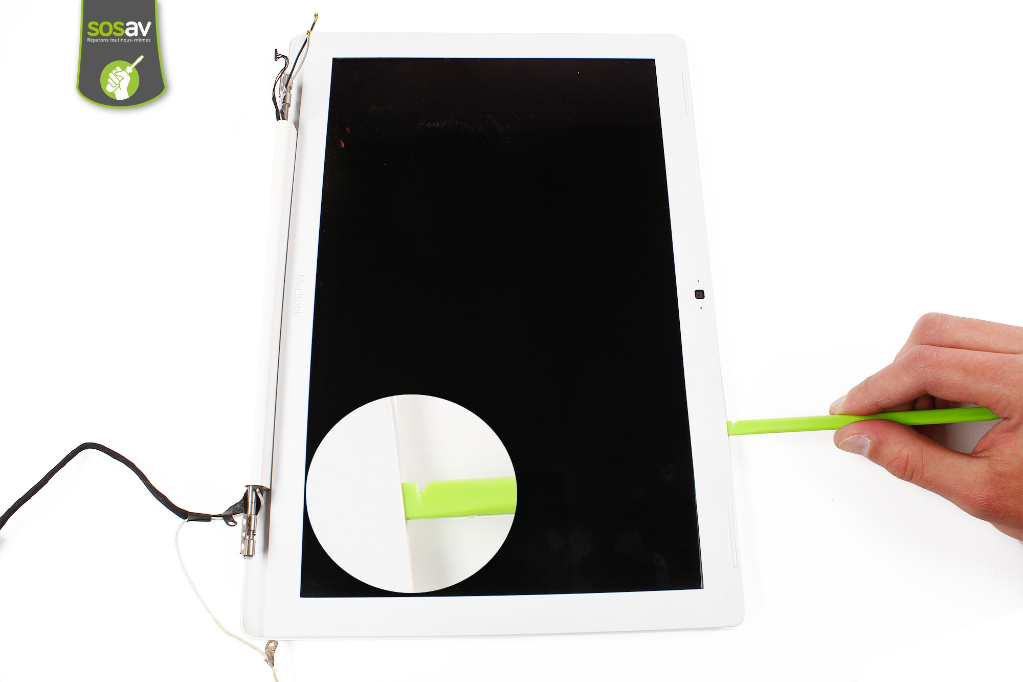 Reprenez la spatule en nylon puis insérez-la délicatement dans l'interstice du cadre de l'écran LCD.Faites ensuite levier afin de déclipser le cadre du reste de l'écran.