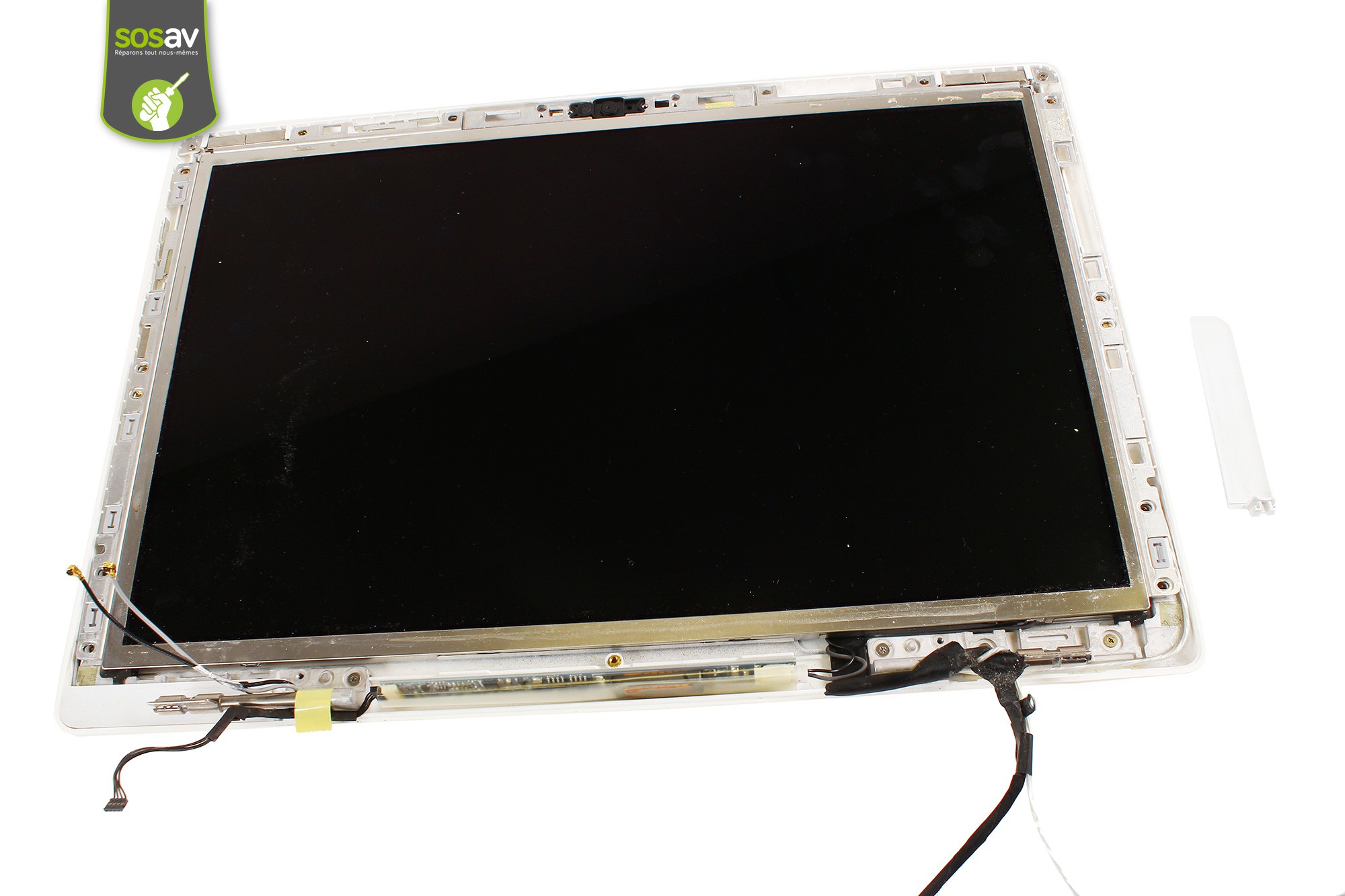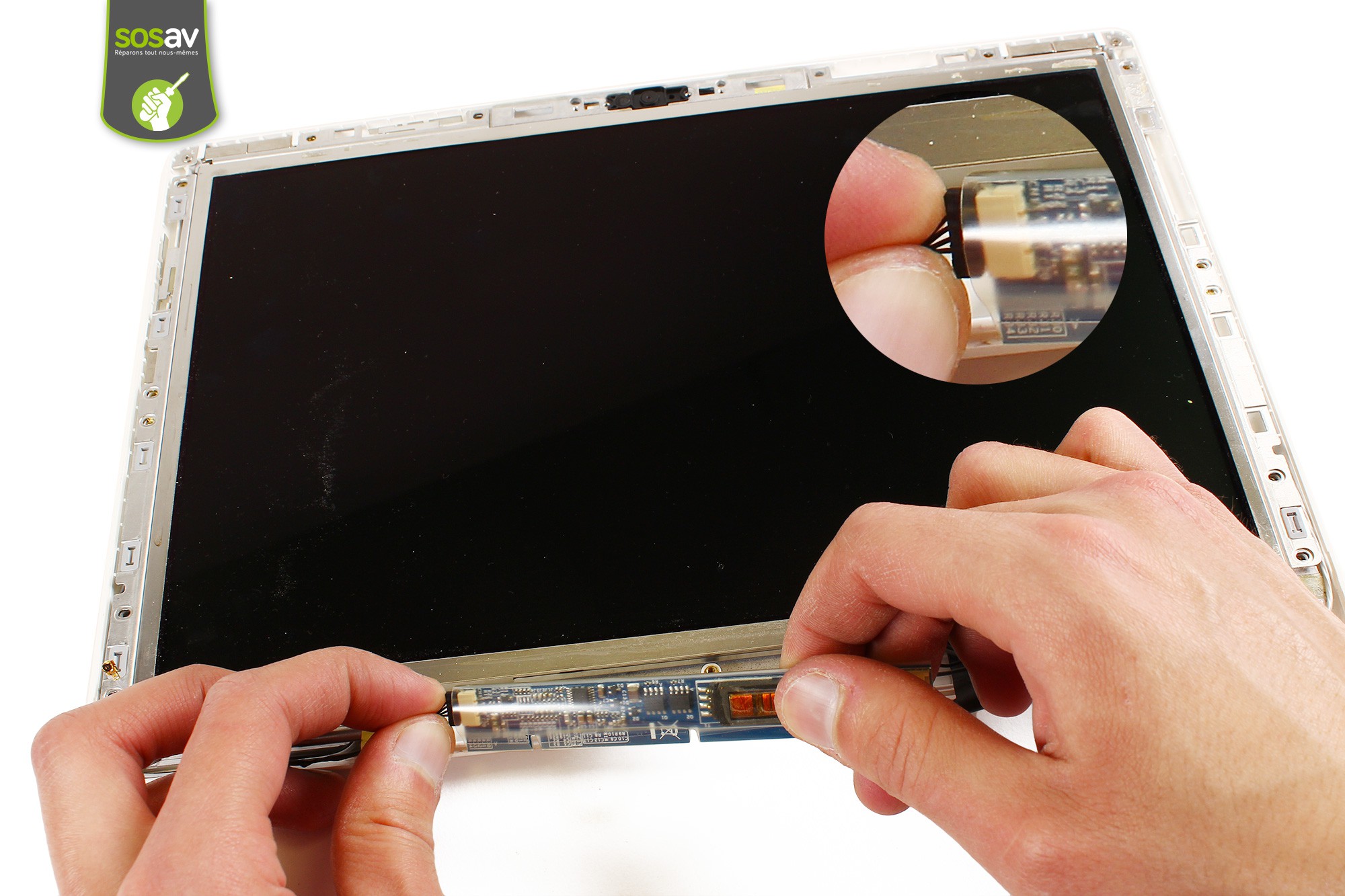 Le cache plastique blanc gauche est désormais démonté.Déconnectez ensuite le câble du rétro-éclairage de l'écran LCD de l'onduleur/inverter.