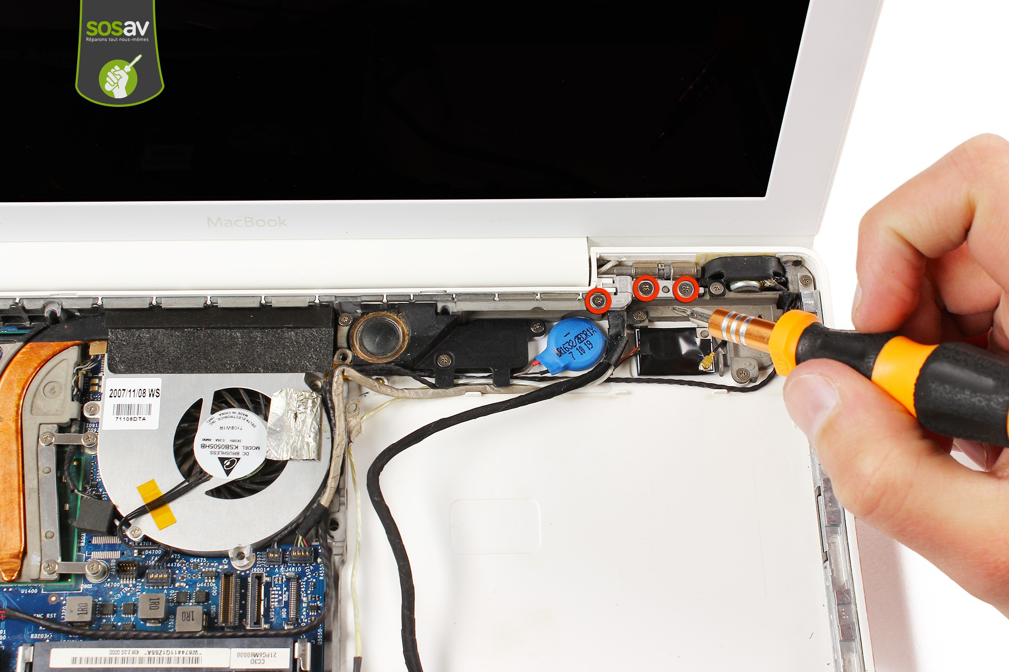 Utilisez le tournevis cruciforme afin de dévisser les trois vis entourées en rouge.Ces vis servent à maintenir l'élément métallique de soutien de la charnière droite de l'écran.