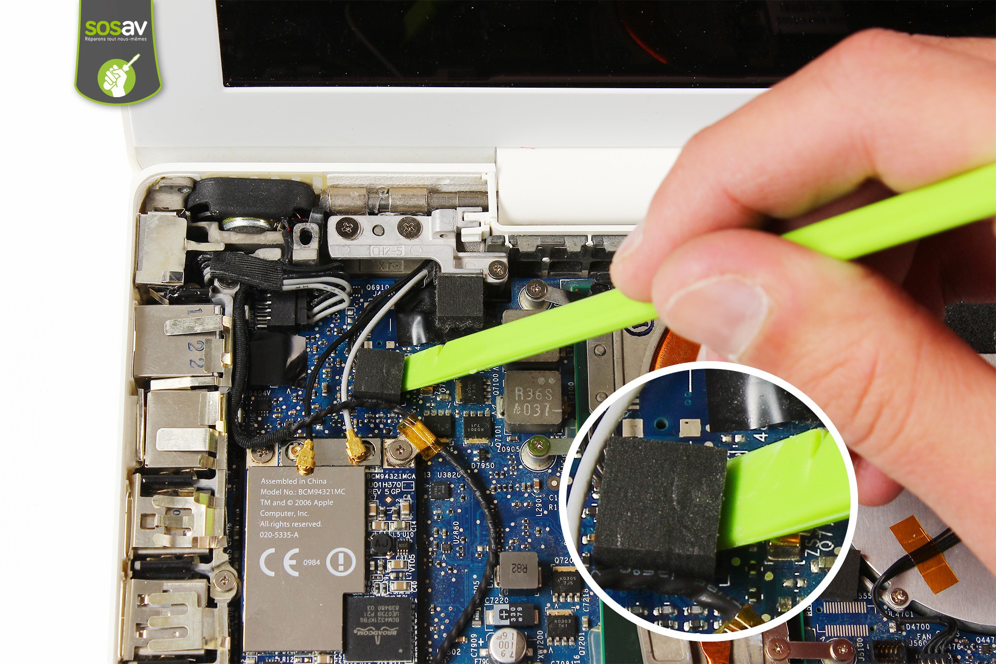 A l'aide de la spatule en nylon, décollez délicatement l'antenne Bluetooth de son support.