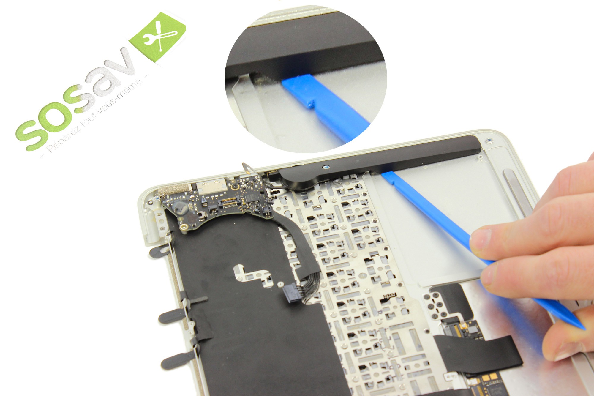 Pour ceci, faites levier avec une spatule en nylon pour soulever le côté droit du connecteur de la batterie.