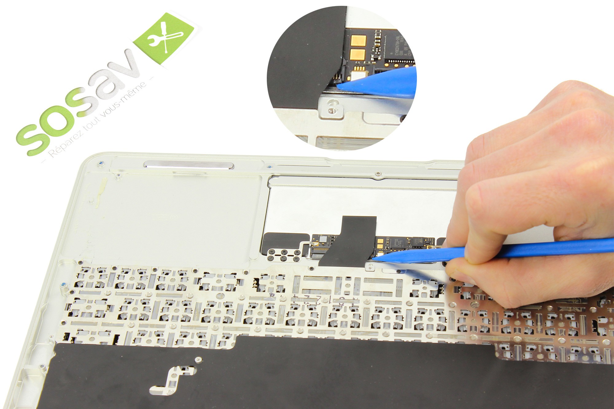 Utilisez la pointe d'une spatule en nylon, pour soulever le clapet retenant la nappe de gestion du clavier dans son connecteur.