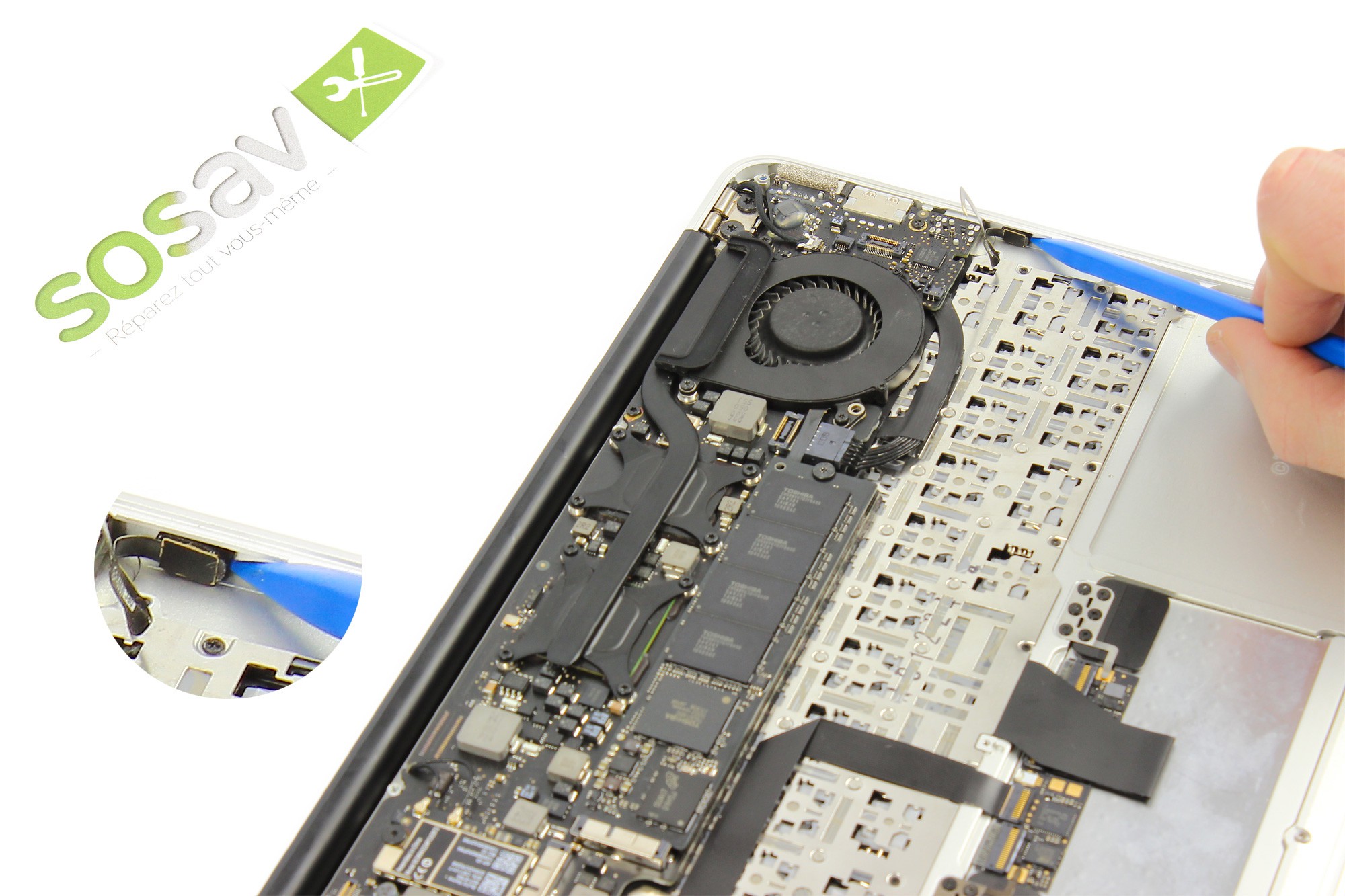 Pour ceci, faites levier avec une spatule en nylon pour soulever le côté droit du connecteur de la batterie.