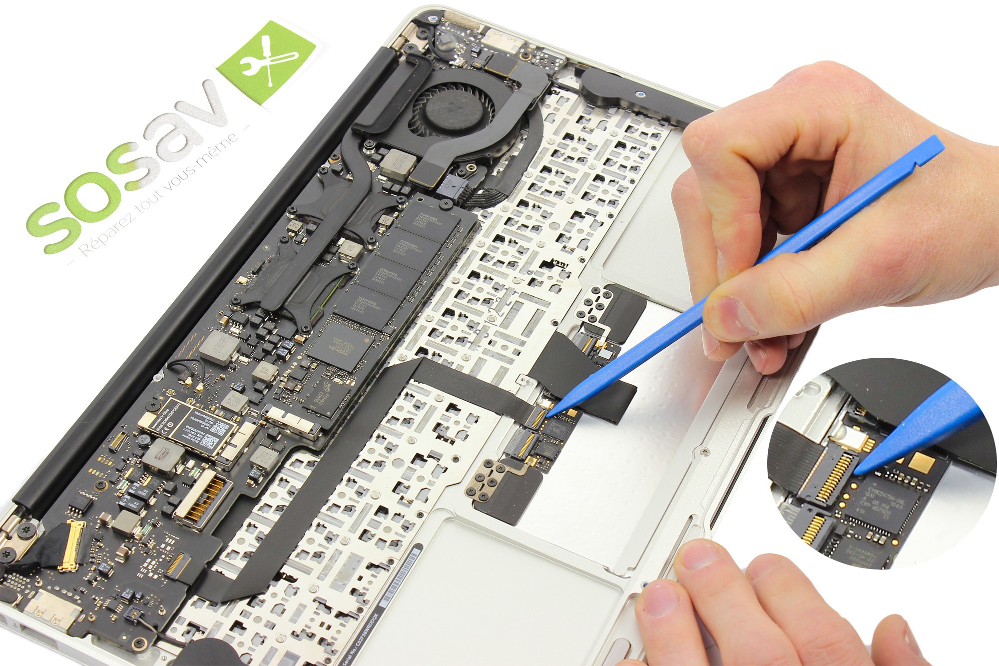 A l'aide d'une spatule en nylon, soulevez le fermoir du connecteur afin de libérer la nappe de connexion du TrackPad.