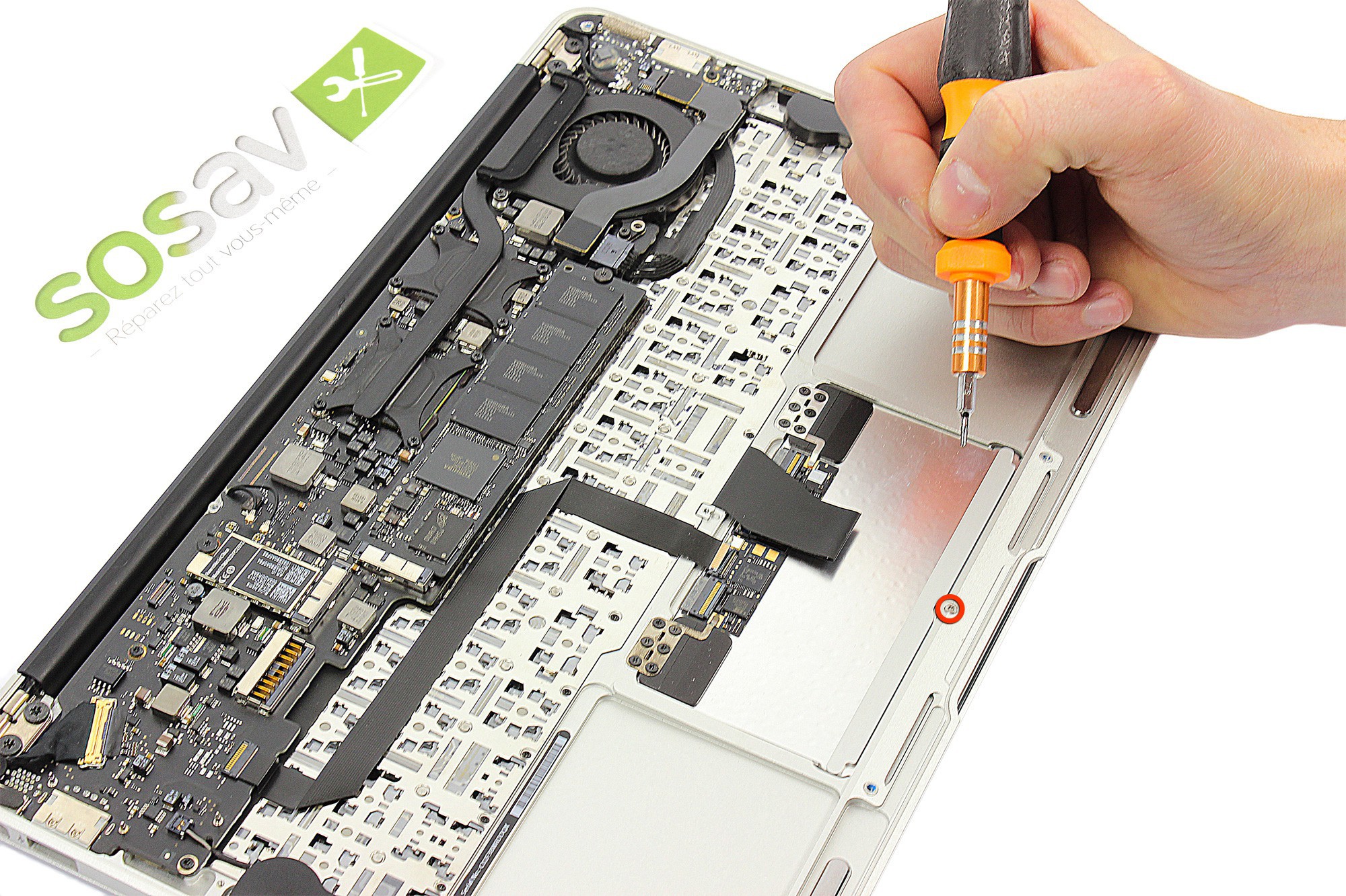 Dévissez désormais la vis Torx T6, entourée en rouge, retenant le TrackPad au châssis du MacBook Air.