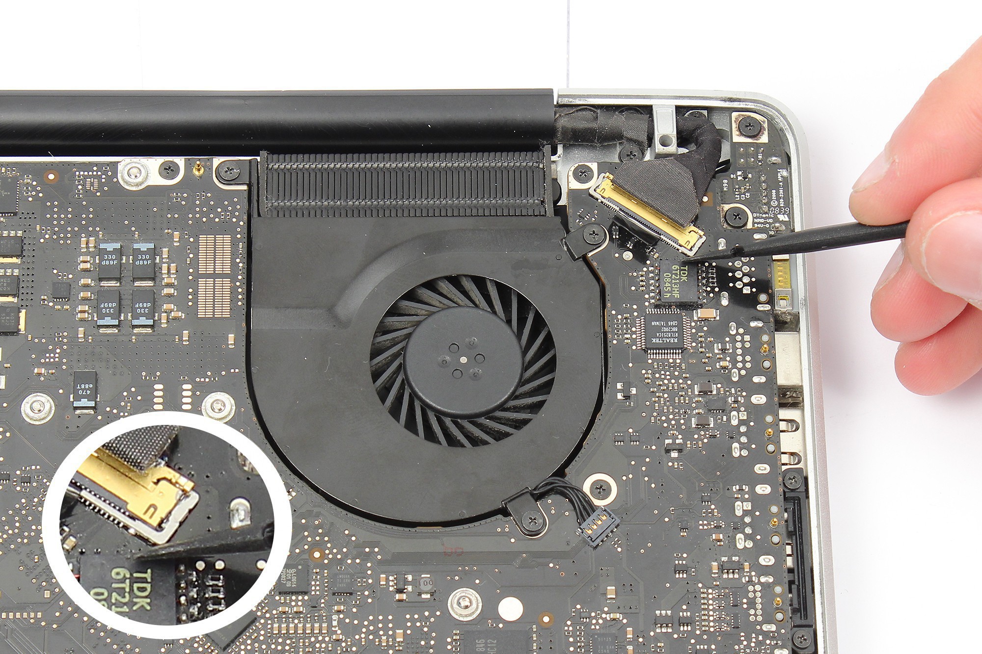 Soulevez ensuite délicatement le taquet métallique de verrouillage localisé sous le connecteur secondaire de la nappe de l'écran LCD (nappe LVDS).