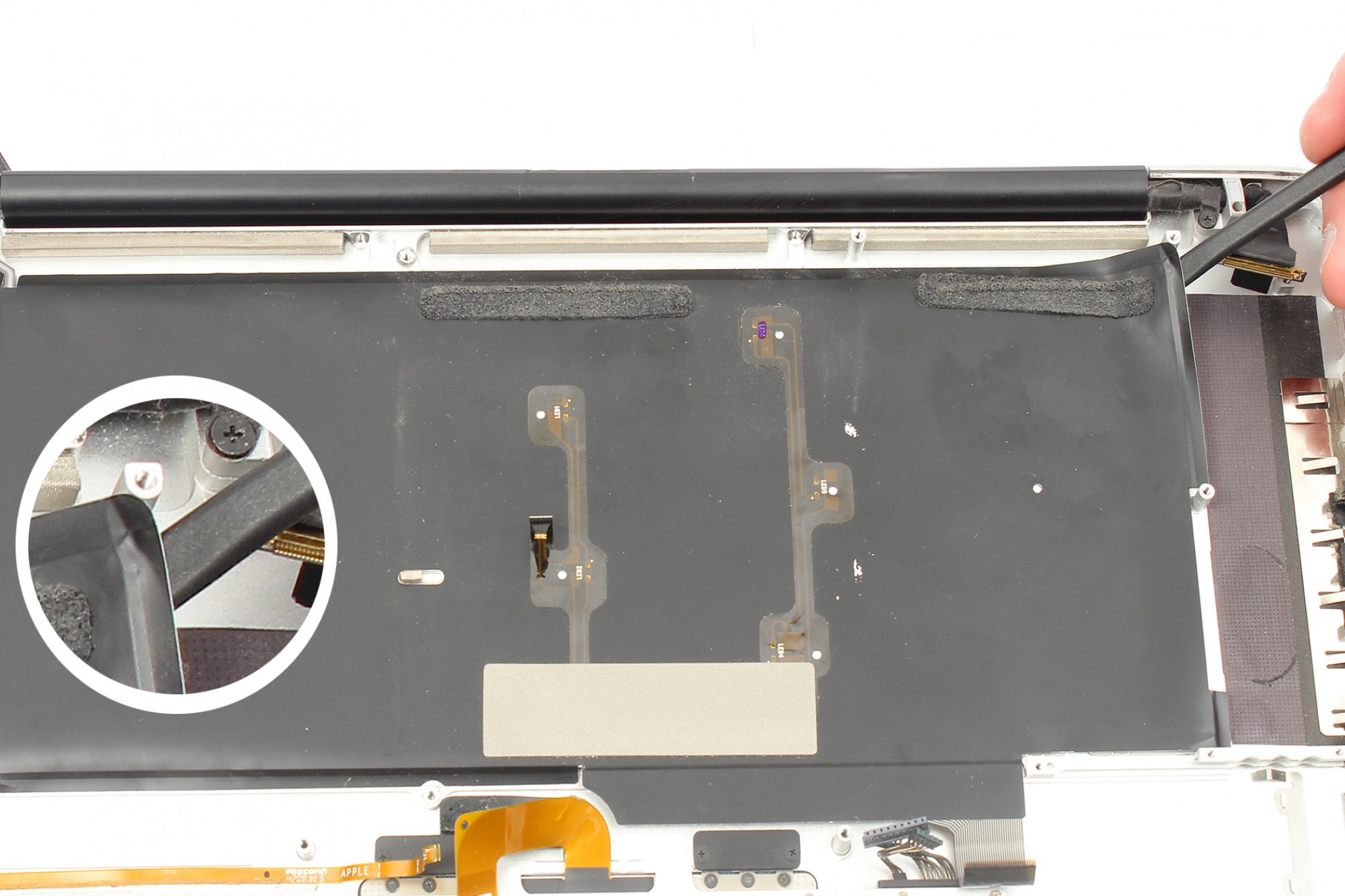 Utilisez la spatule en nylon afin de déconnecter délicatement la nappe du trackpad.