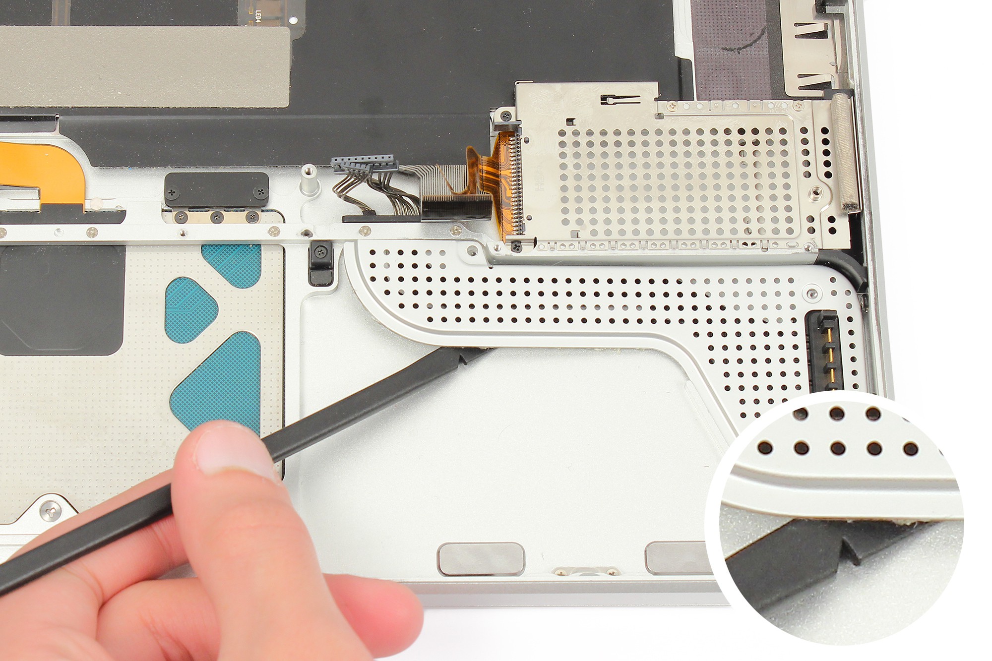A l'aide de la pointe de la spatule en nylon, retirez en douceur la nappe du clavier.