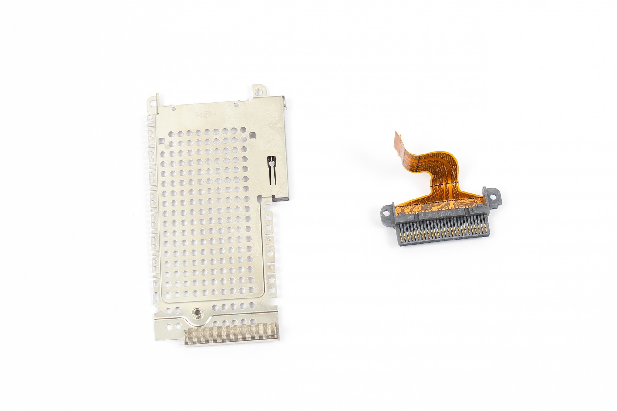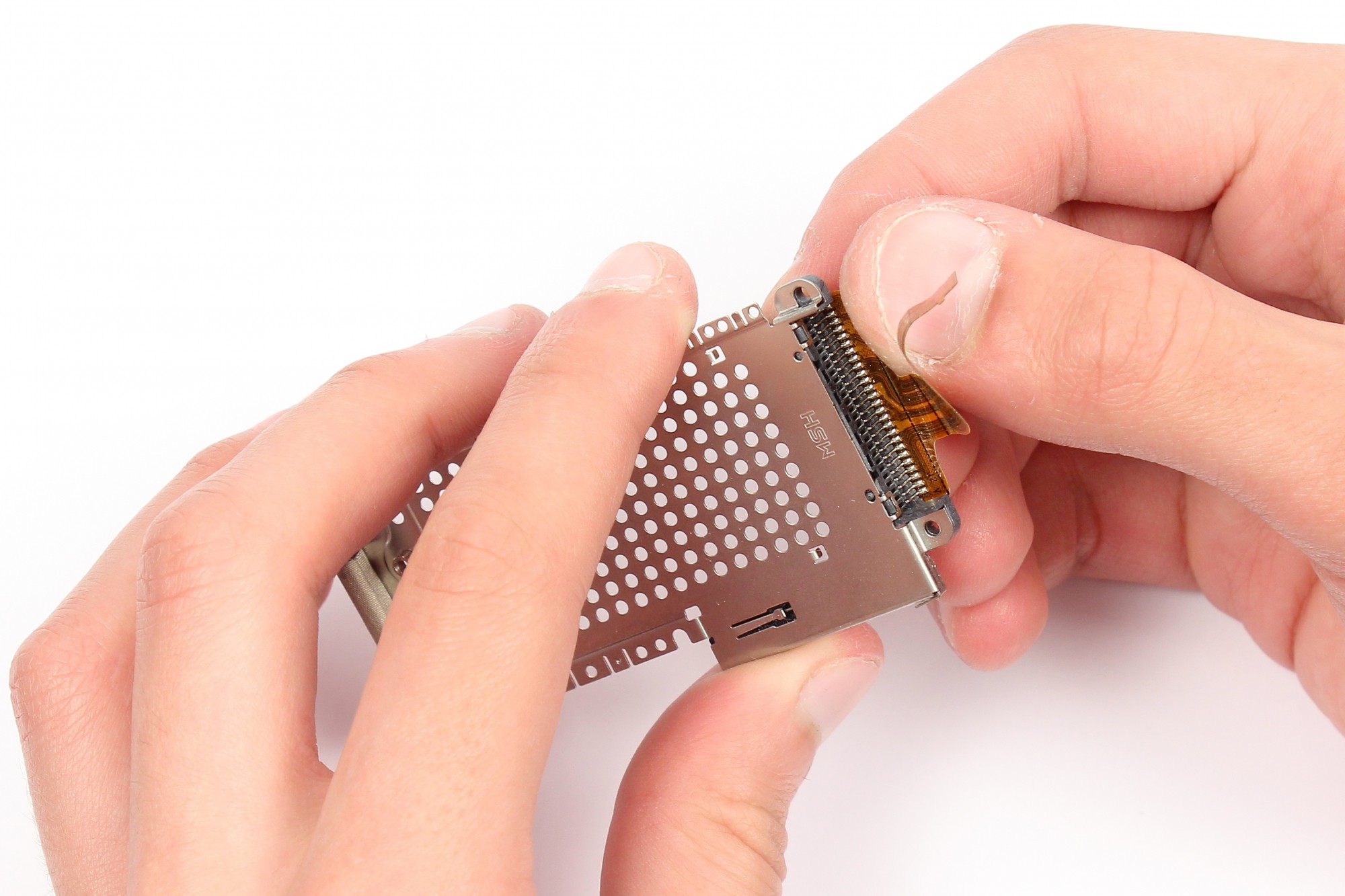 Toujours avec cette spatule en nylon, déverrouillez le connecteur FPC de la nappe de liaison de l'emplacement pour carte Express.