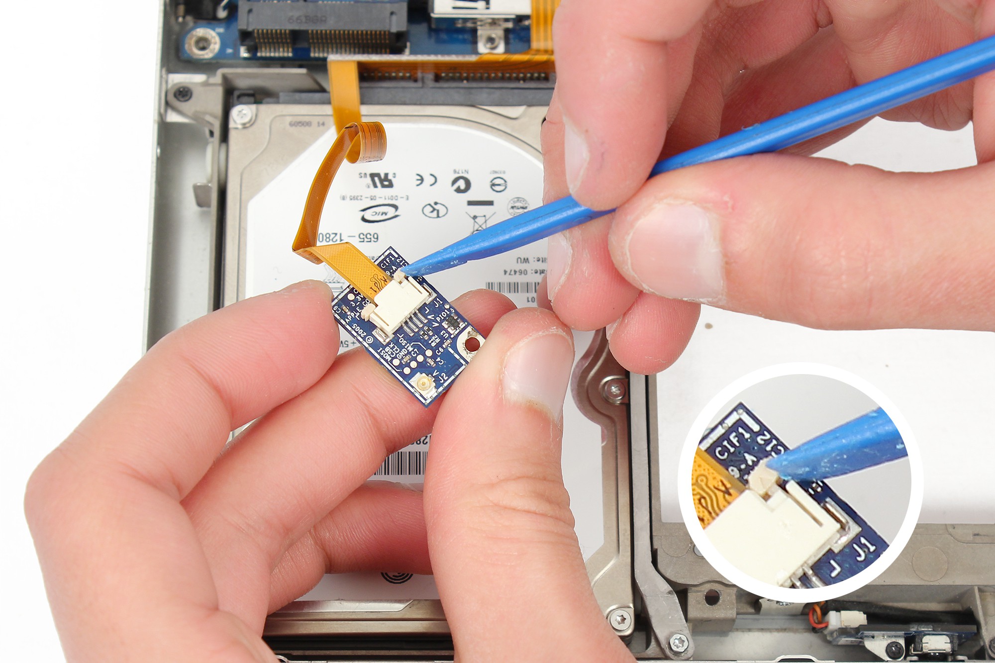 A l'aide d'une spatule en nylon, retirez et déconnectez délicatement la nappe de liaison du châssis supérieur à la carte mère.