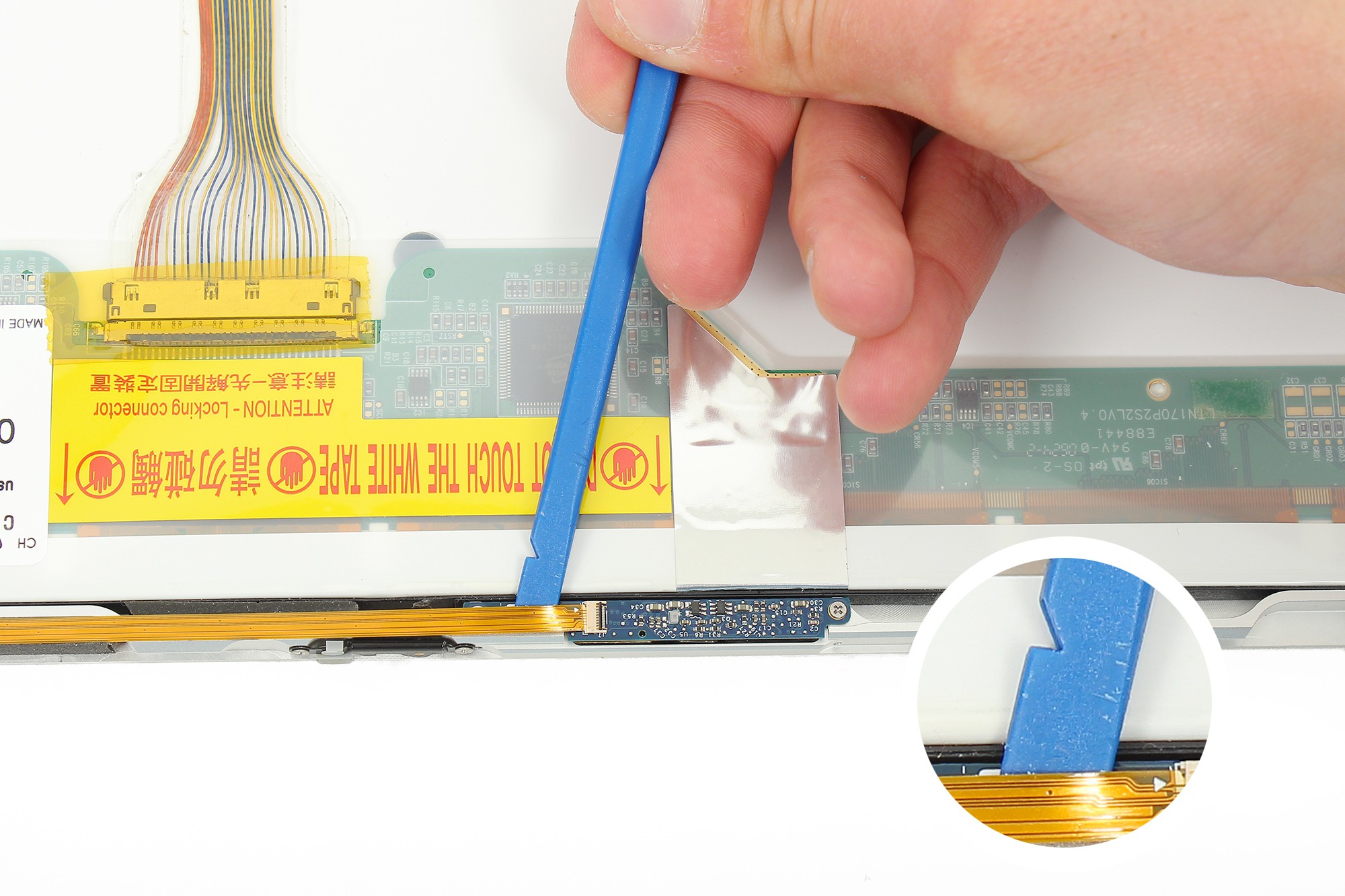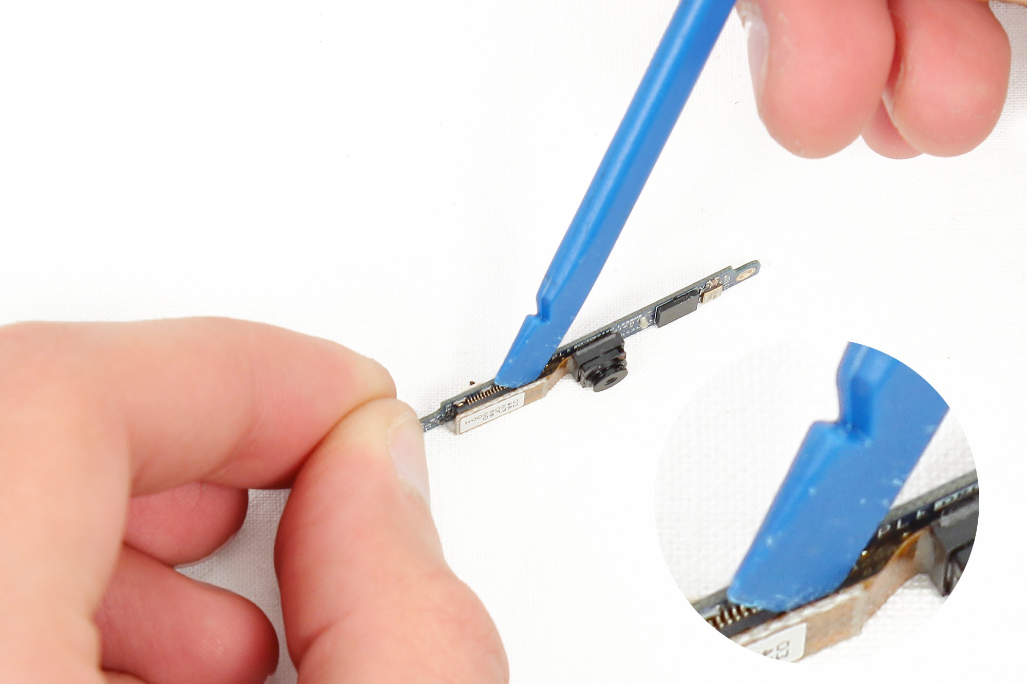 En réutilisant la spatule en nylon, déconnectez délicatement la nappe de la caméra de sa carte de gestion.