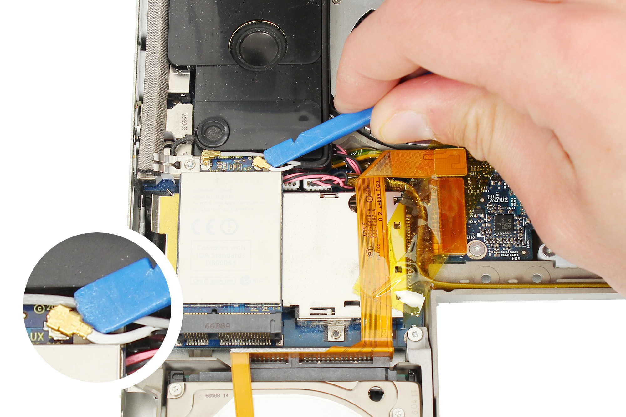 En vous aidant de la spatule en nylon, déconnectez délicatement la première antenne de la carte WiFi.