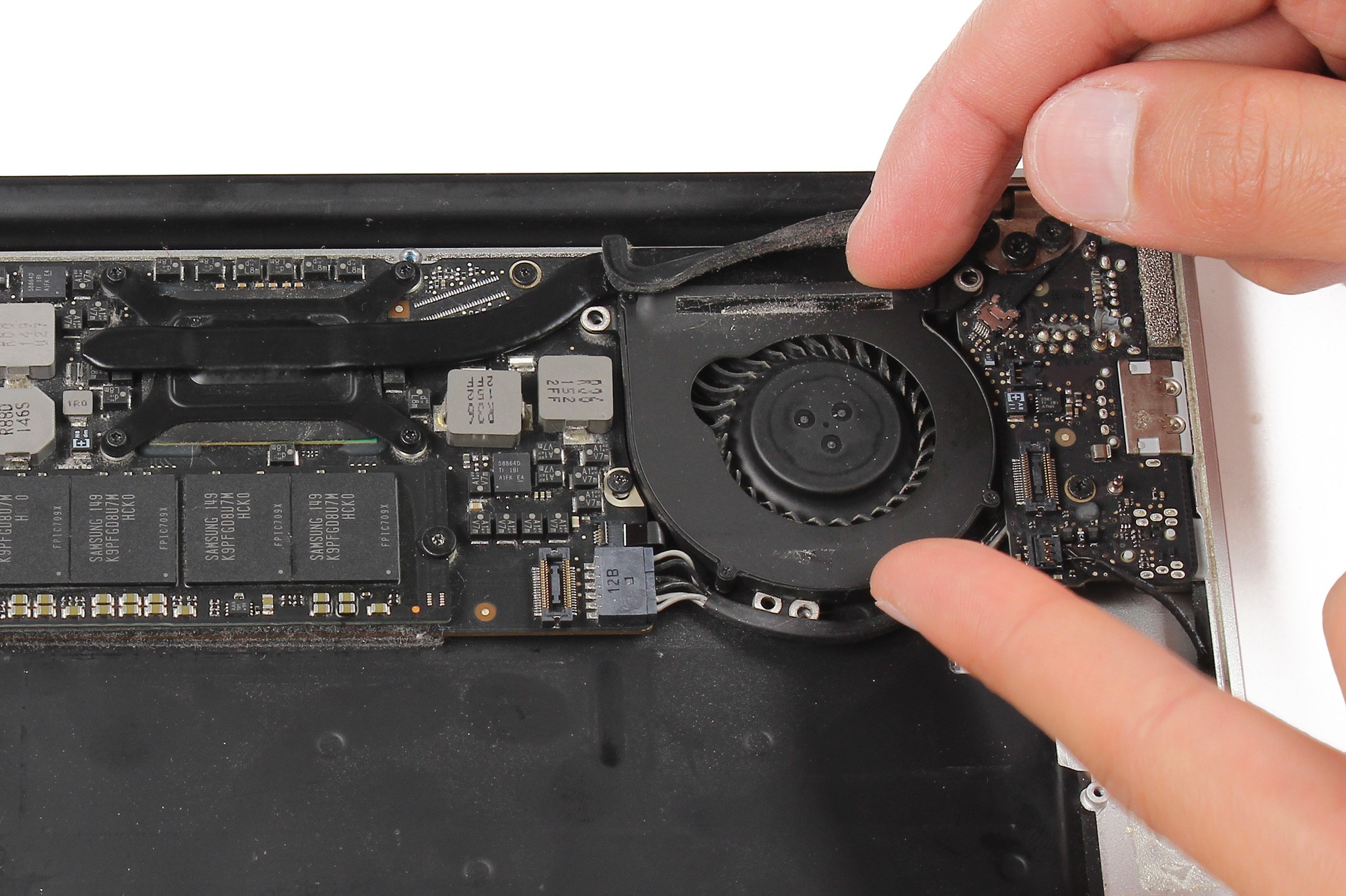 Décollez ensuite délicatement le caoutchouc de maintien du ventilateur, comme indiqué sur les photos.