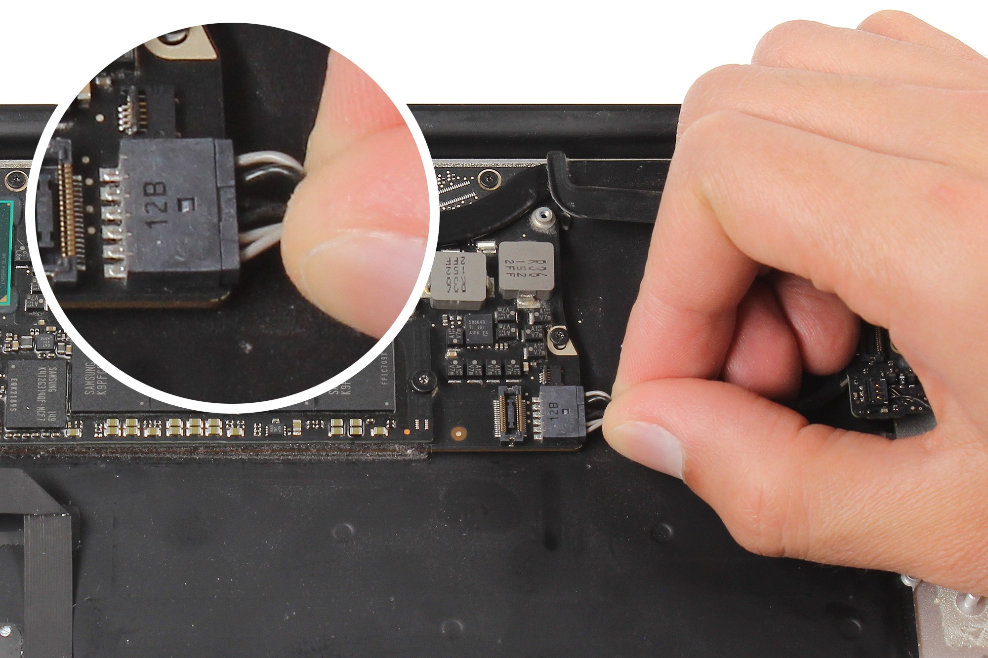 Tirez ensuite délicatement sur le connecteur de batterie afin de le déconnecter de la carte mère.Utilisez la languette plastique pour plus de simplicité lors de la deconnexion du connecteur de la batterie.