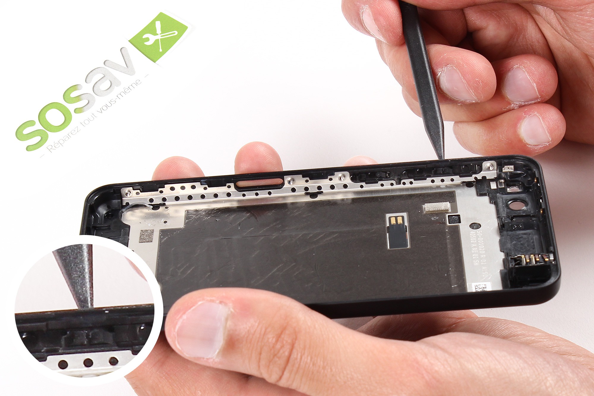 Toujours avec la spatule en nylon, retirez le support ainsi que sa nappe gérant les boutons volume et appareil photo.