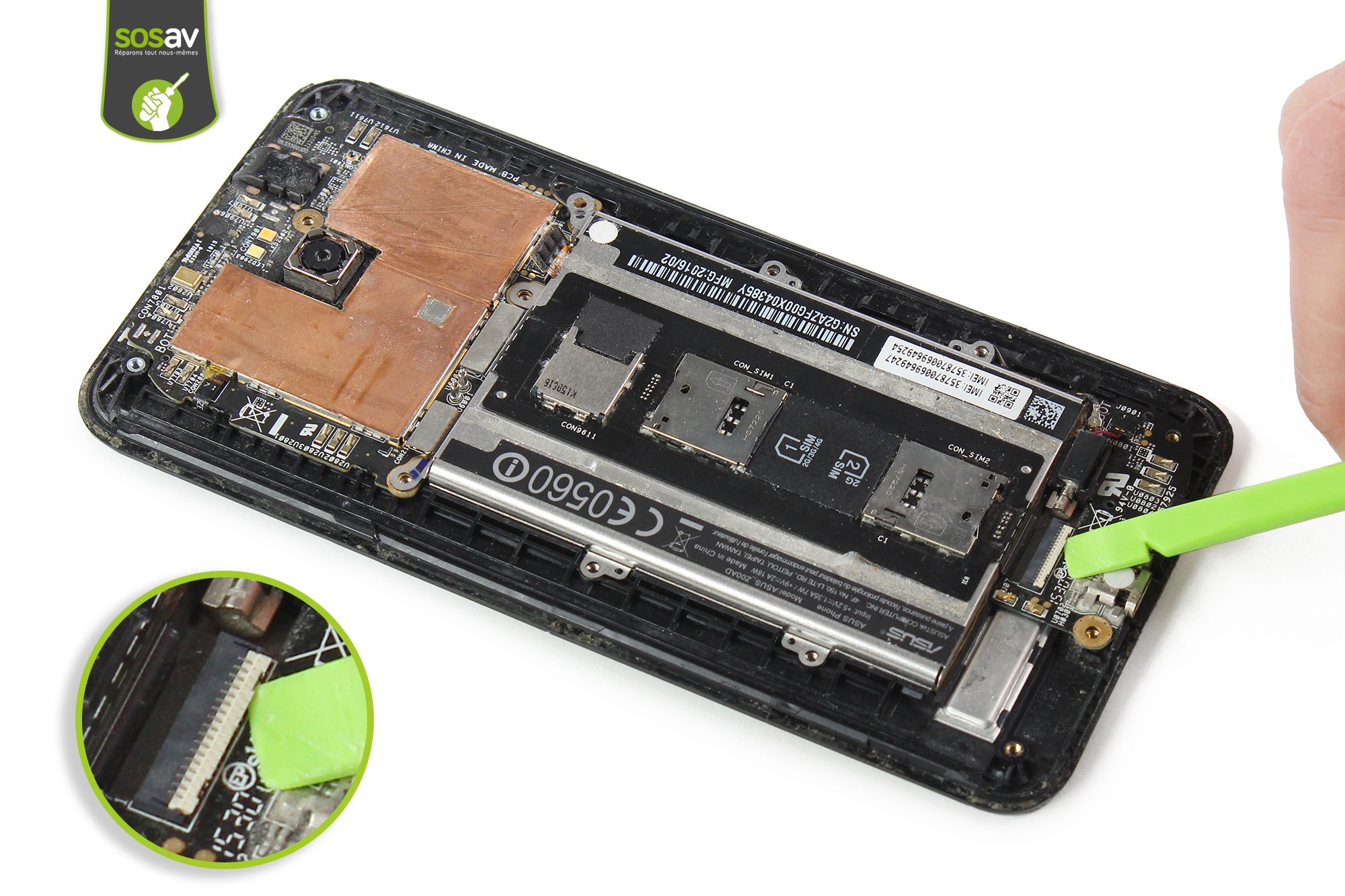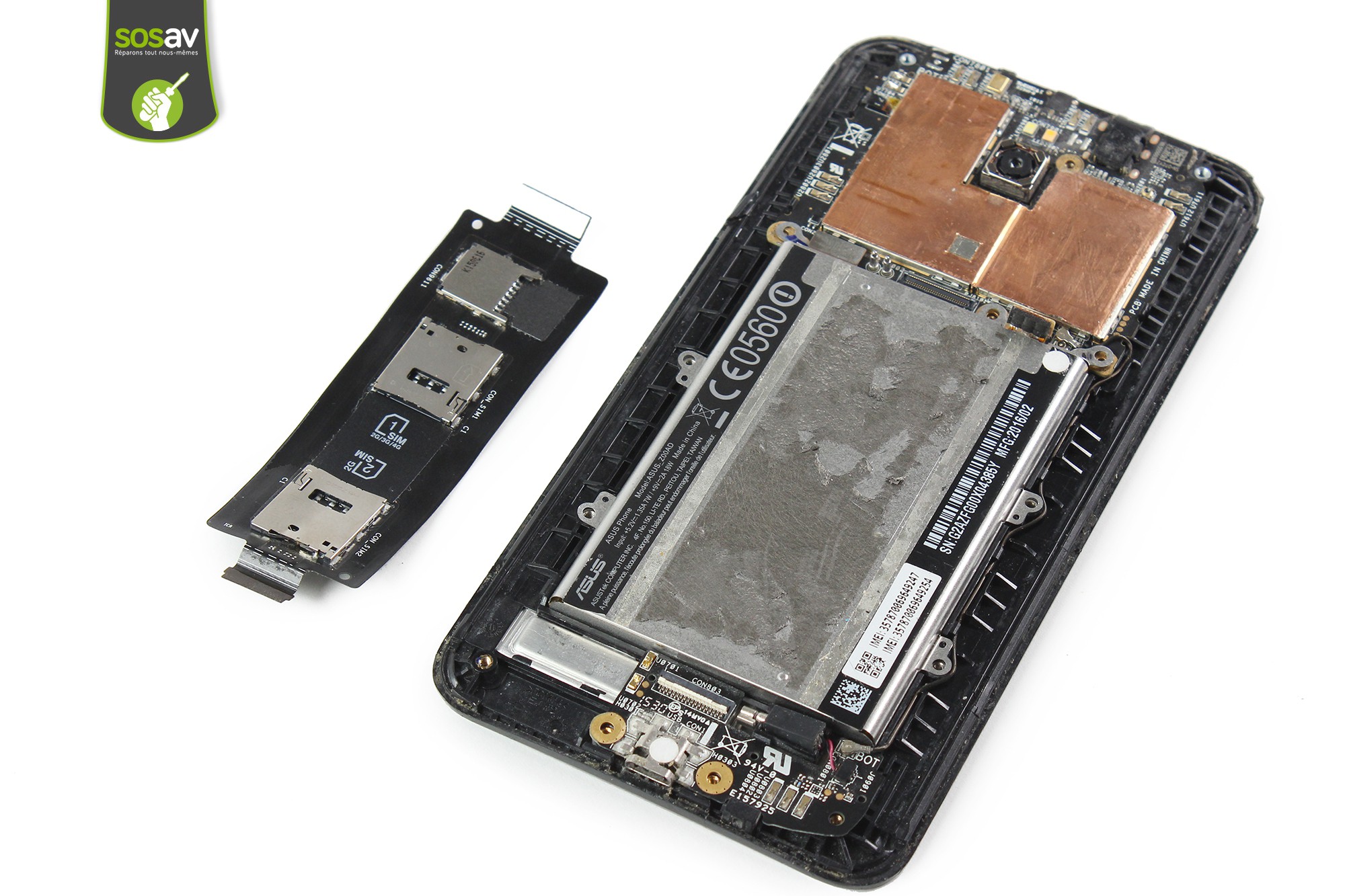 Votre Zenfone 2 ne reconnaît plus votre carte SIM ? Même après avoir essayé avec une autre carte SIM, le résultat reste négatif... Idem avec la carte SD qui est illisible ou tout simplement pas détectée.... Bref, vous ne pouvez plus utiliser votre téléphone et vous cherchez une solution rapide pour résoudre tous vos soucis. Vous faites bien de demander de l'aide à SOSav car nos experts ont réalisé ce guide de réparation pour vous expliquer comment changer votre lecteur SIM & SD Zenfone 2 vous-même. Car oui, réparer son smartphone est à la portée de tous et vous pourrez oublier tous les petits tracas rencontrés jusqu'à présent. Il faut simplement se jeter à l'eau sur les conseils de nos techniciens.