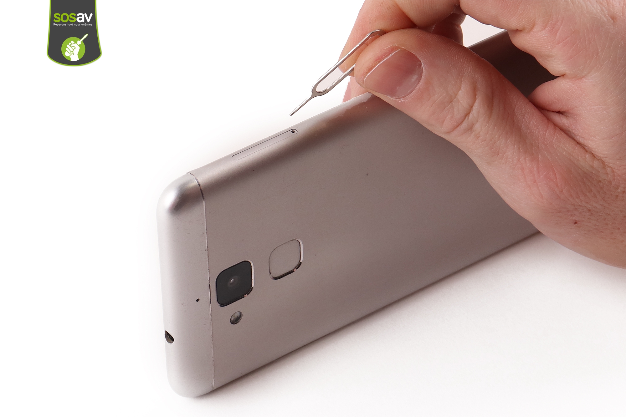Introduisez l'éjecteur SIM (présent dans la boîte du téléphone ou notre kit outils) dans le trou du tiroir SIM se trouvant sur la tranche gauche, afin de l'extraire.