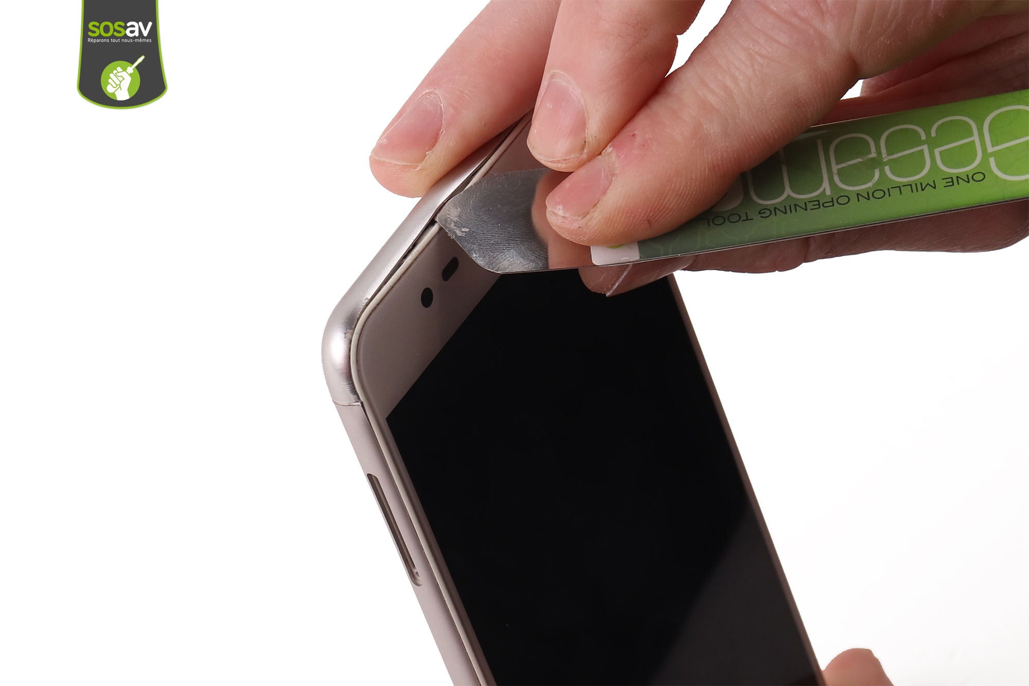 Crééz une ouverture entre la coque et l'écran grâce à la iSesamo.Puis prenez le relais avec la spatule en nylon pour déclipser tout le pourtour.