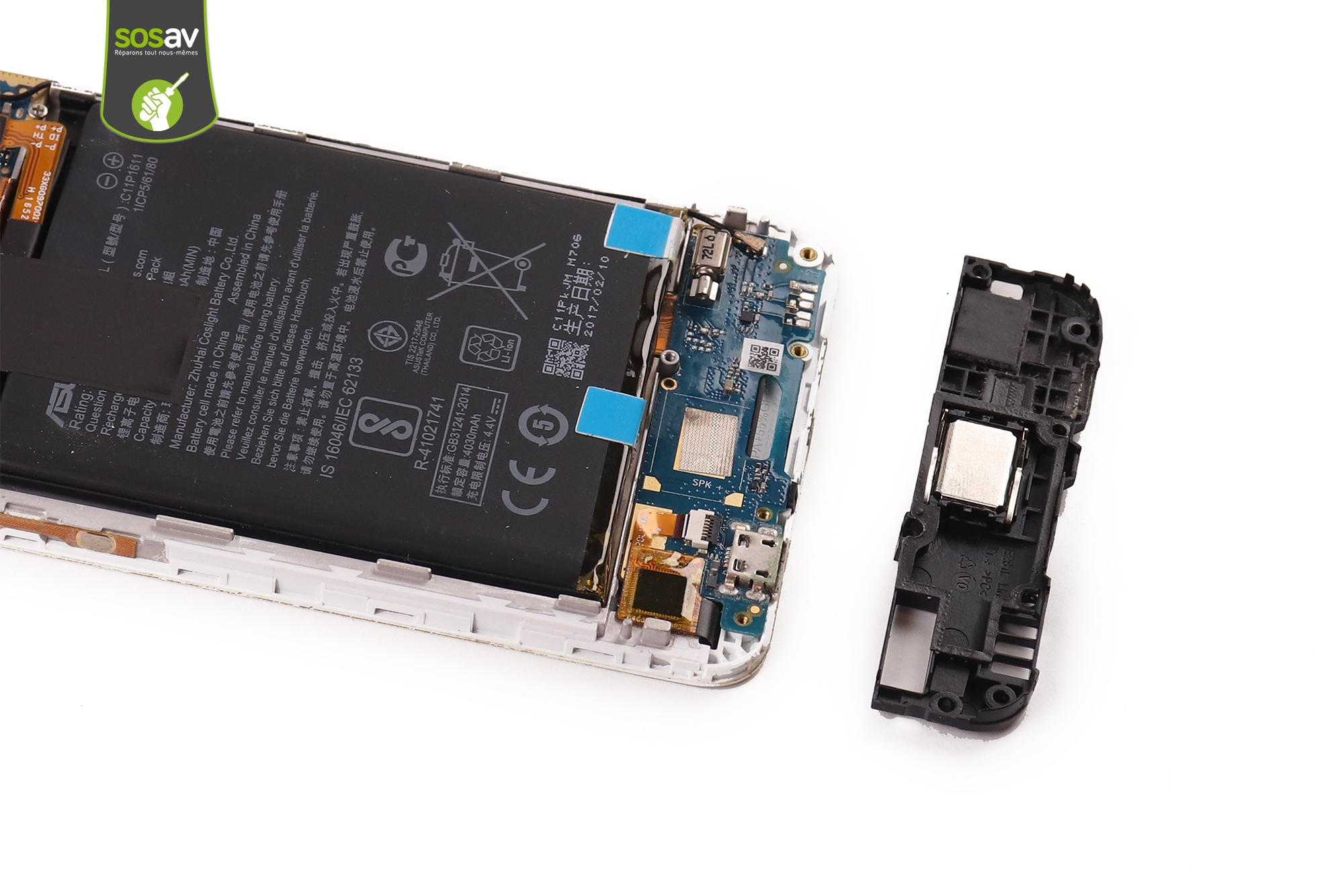 Votre Zenfone 3 Max n'émet plus aucun son ? Impossible de l'entendre sonner ou de regarder une série streaming sans son qui grésille ? Pourtant, le son des appels passe normalement ? C'est parce qu'il s'agit d'un autre haut-parleur ! Ici, c'est votre haut-parleur externe Asus Zenfone 3 Max qui est en cause ! C'est lui qui gère tout le son du téléphone, sauf celui des appels (à moins d'être en mode haut-parleur). Il se situe en bas du téléphone et peut se changer facilement en suivant les étapes illustrées et commentées de ce guide de réparation. Les techniciens SOSav vous accompagnent tout au long de la manoeuvre pour redonner de la voix à votre mobile !