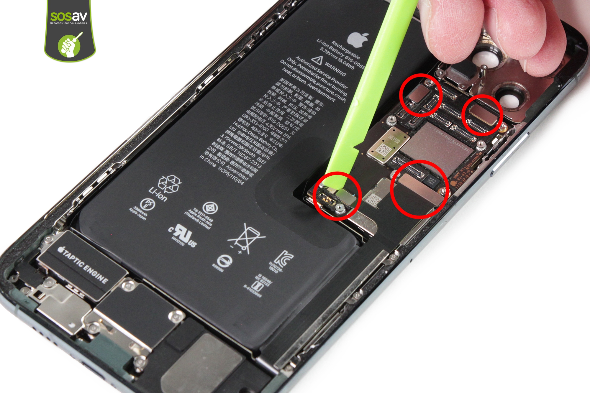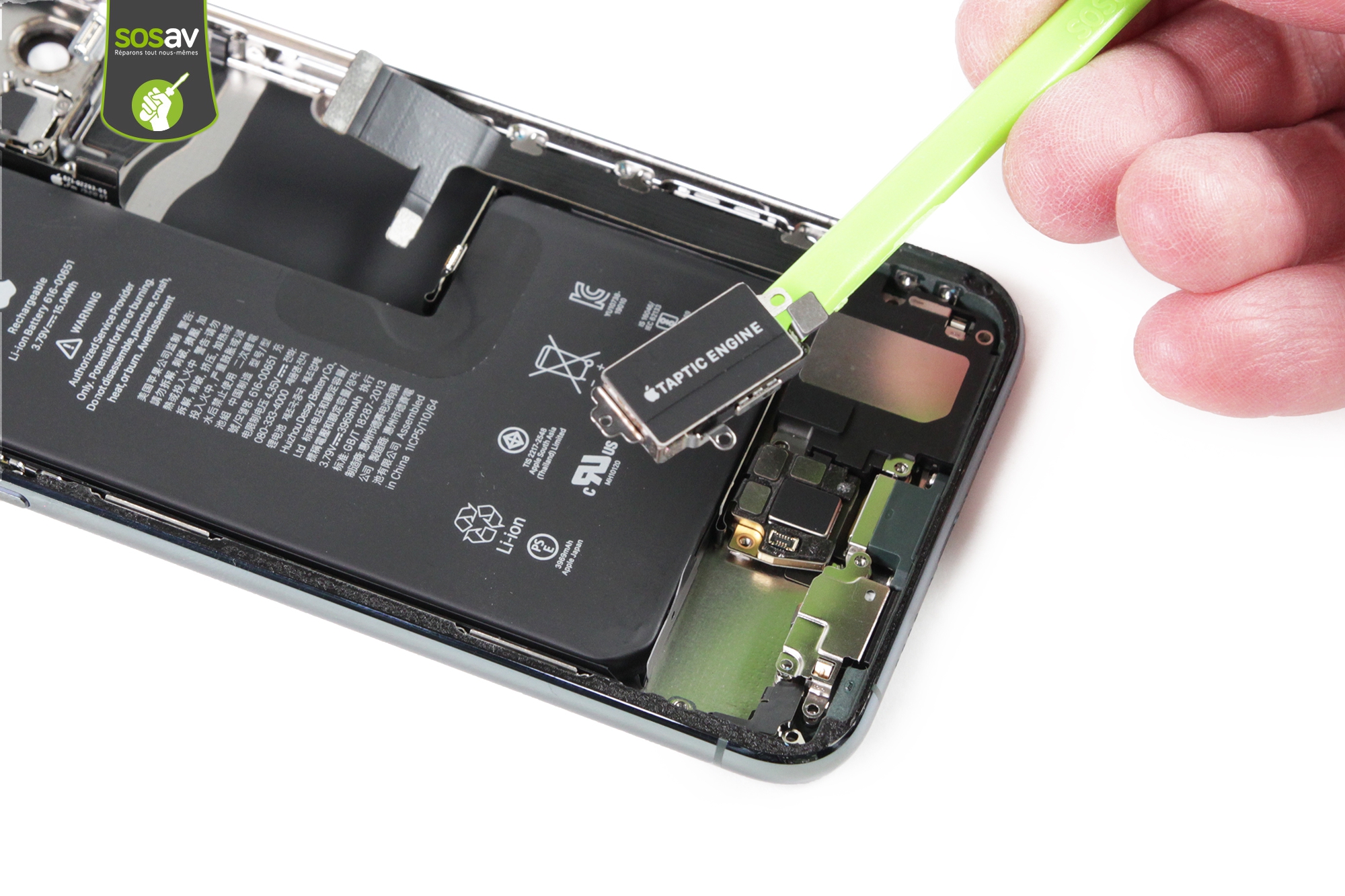 ...Nous voici batterie en main !D'une capacité de 3969 mAh et d'une tension de 3,79V, cette batterie en "L" d'un seul bloc assure l'autonomie de l'iPhone 11 Pro Max.