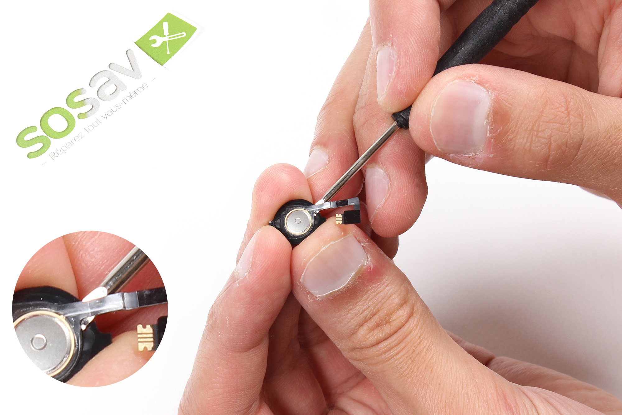 Utilisez ensuite une pince afin d'extraire l'élément métallique placé à côté du connecteur batterie du téléphone.