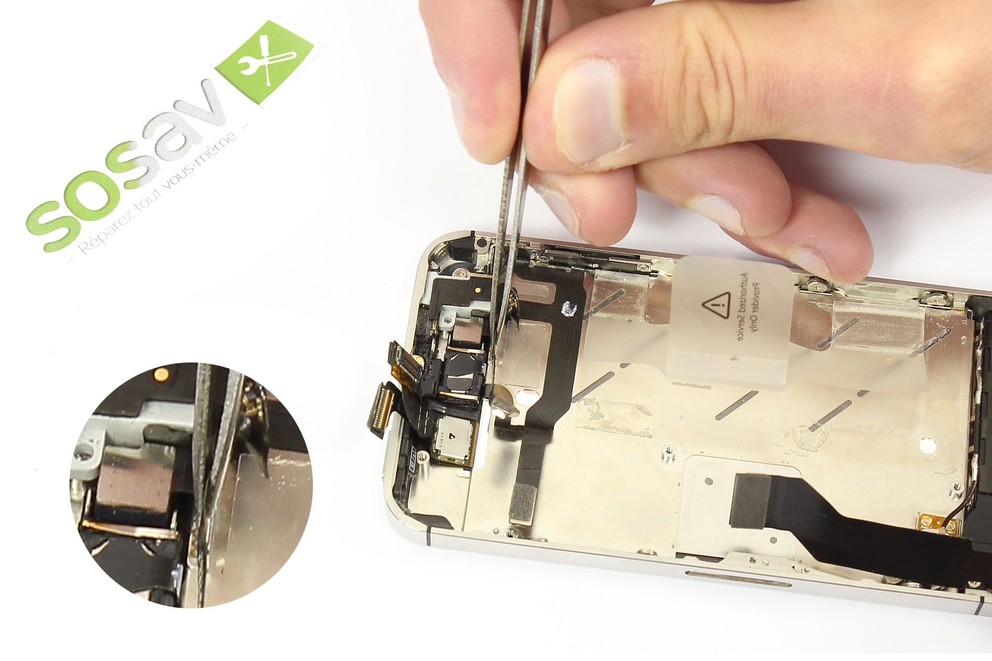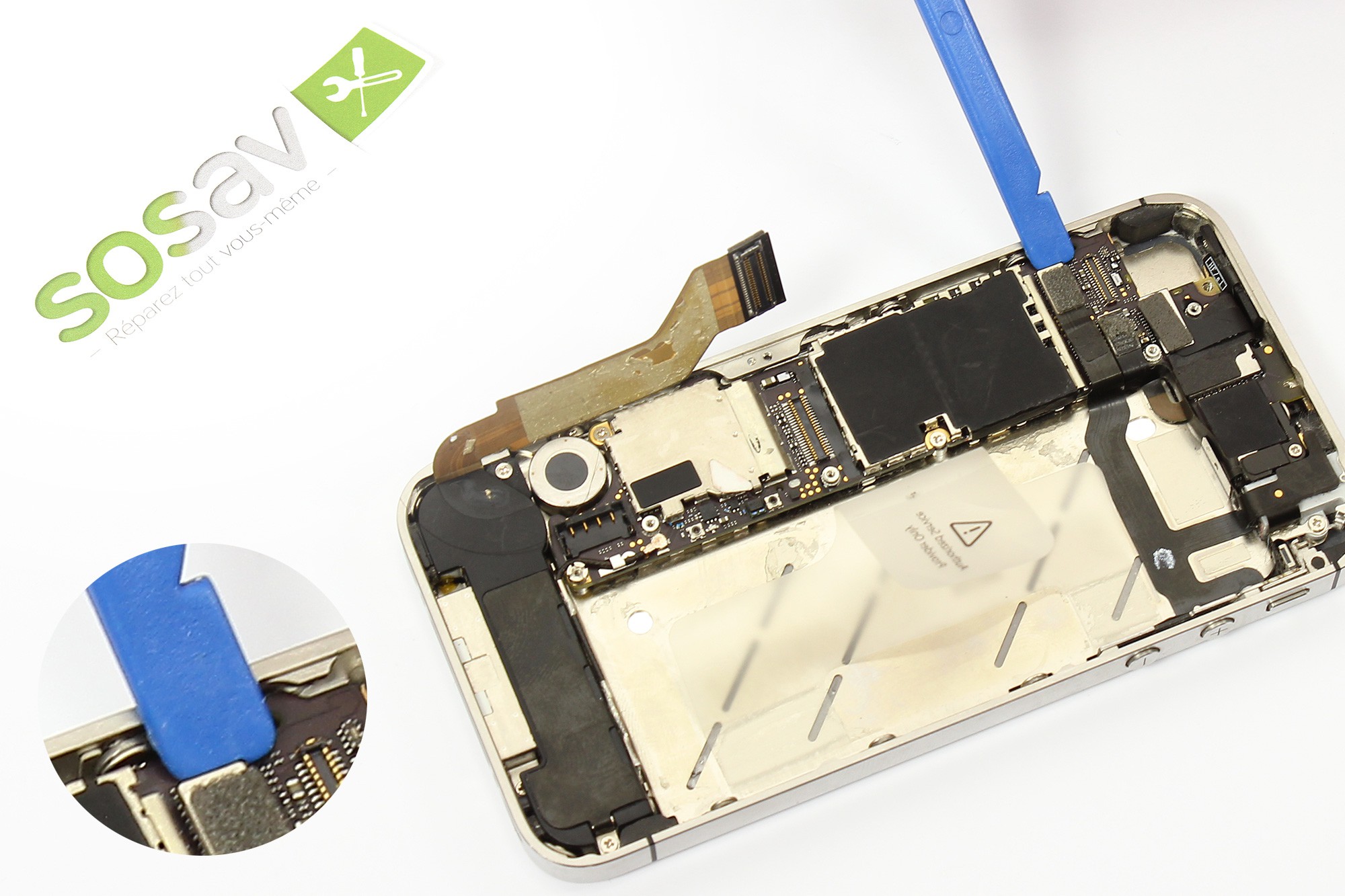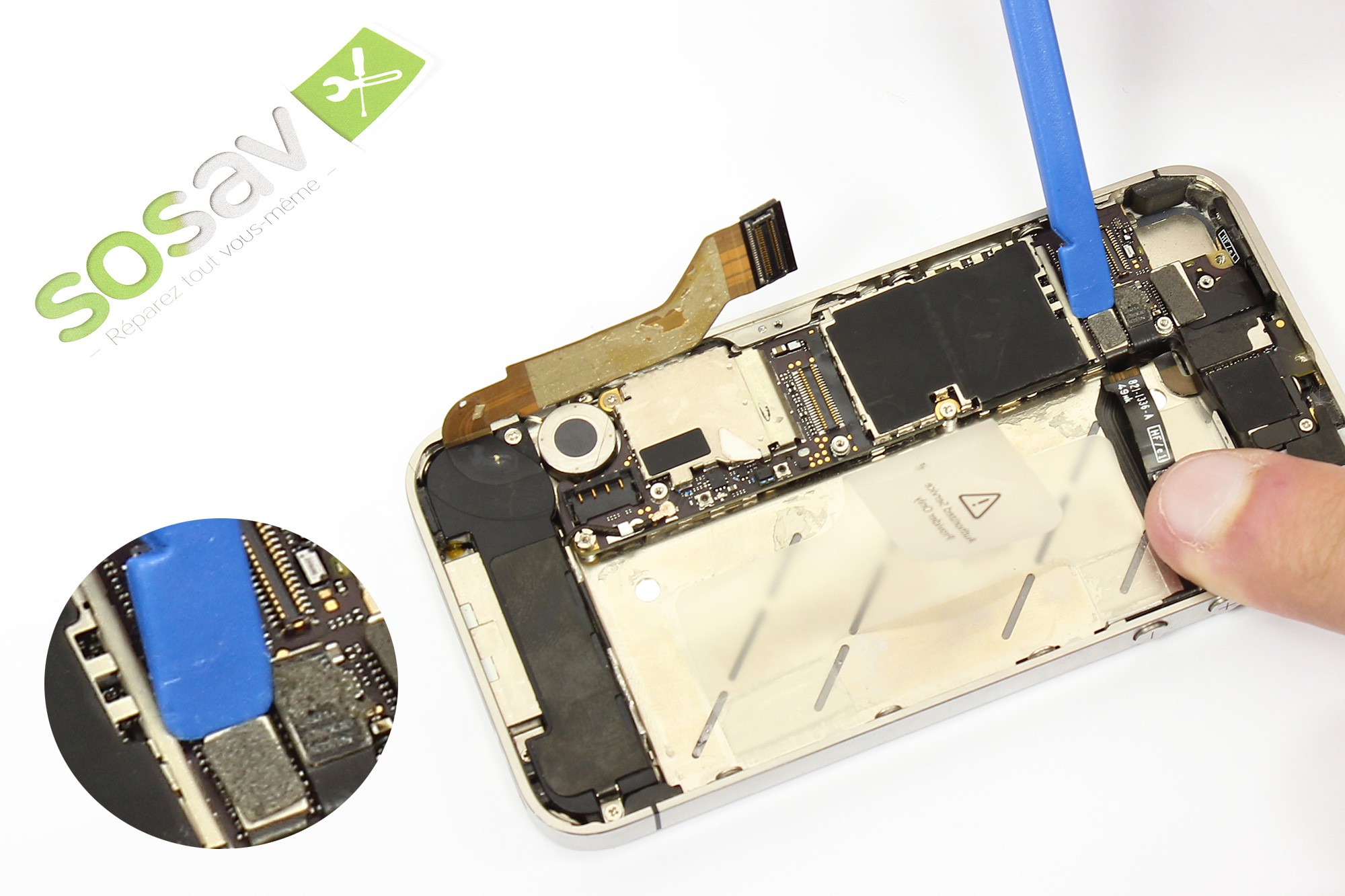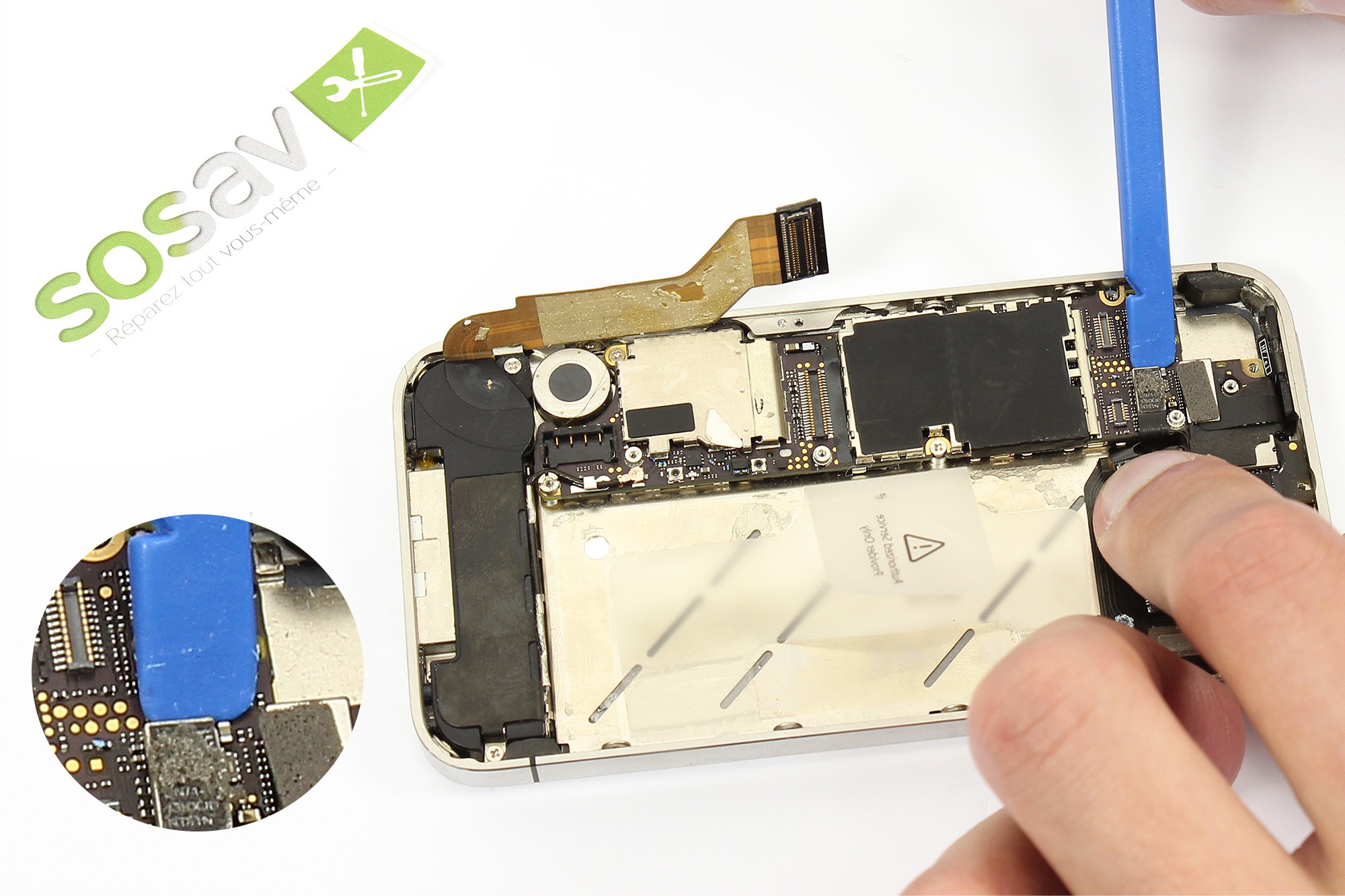 Utilisez ensuite une pince afin d'extraire l'élément métallique placé à côté du connecteur batterie du téléphone.