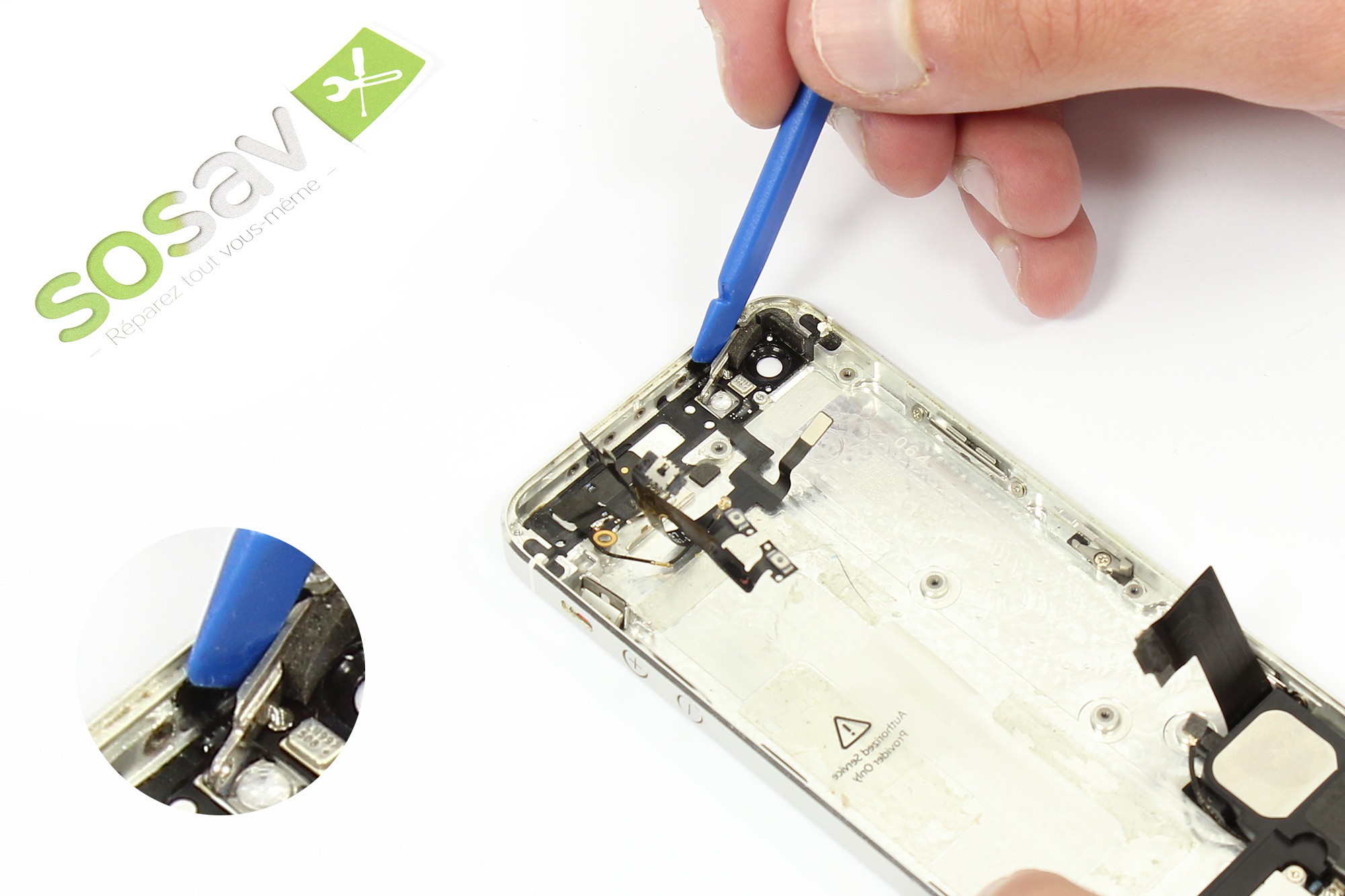 Utilisez la spatule en nylon afin de déclipser le connecteur de l'antenne GSM présent juste à côté du haut-parleur bas (appelé aussi haut-parleur externe) du téléphone.