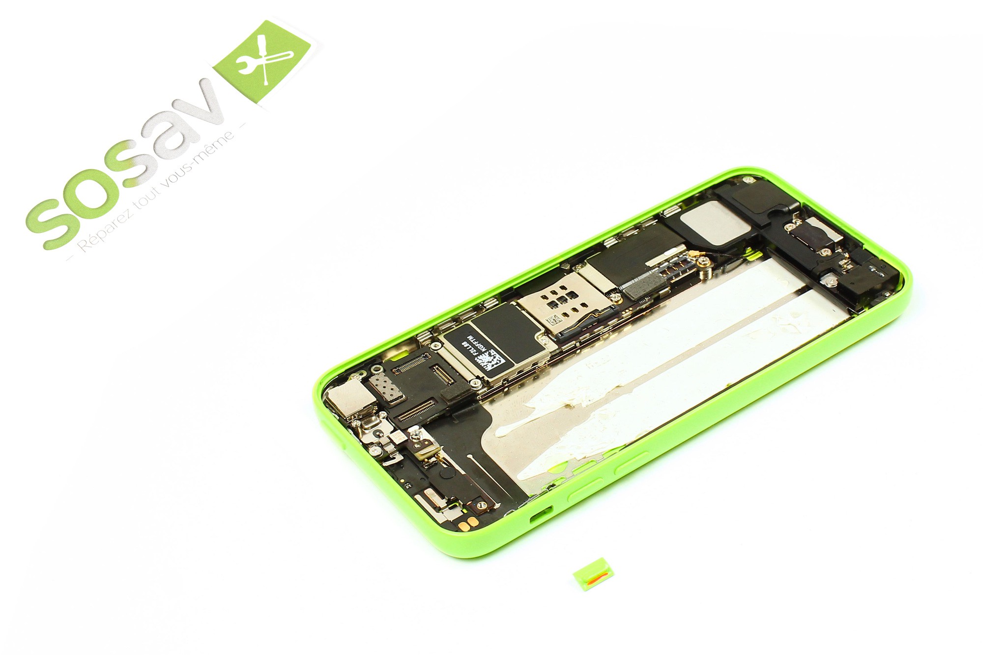 Vous pouvez désormais, à l'aide d'une pince, ôter complètement le bouton vibreur de votre iPhone 5C.