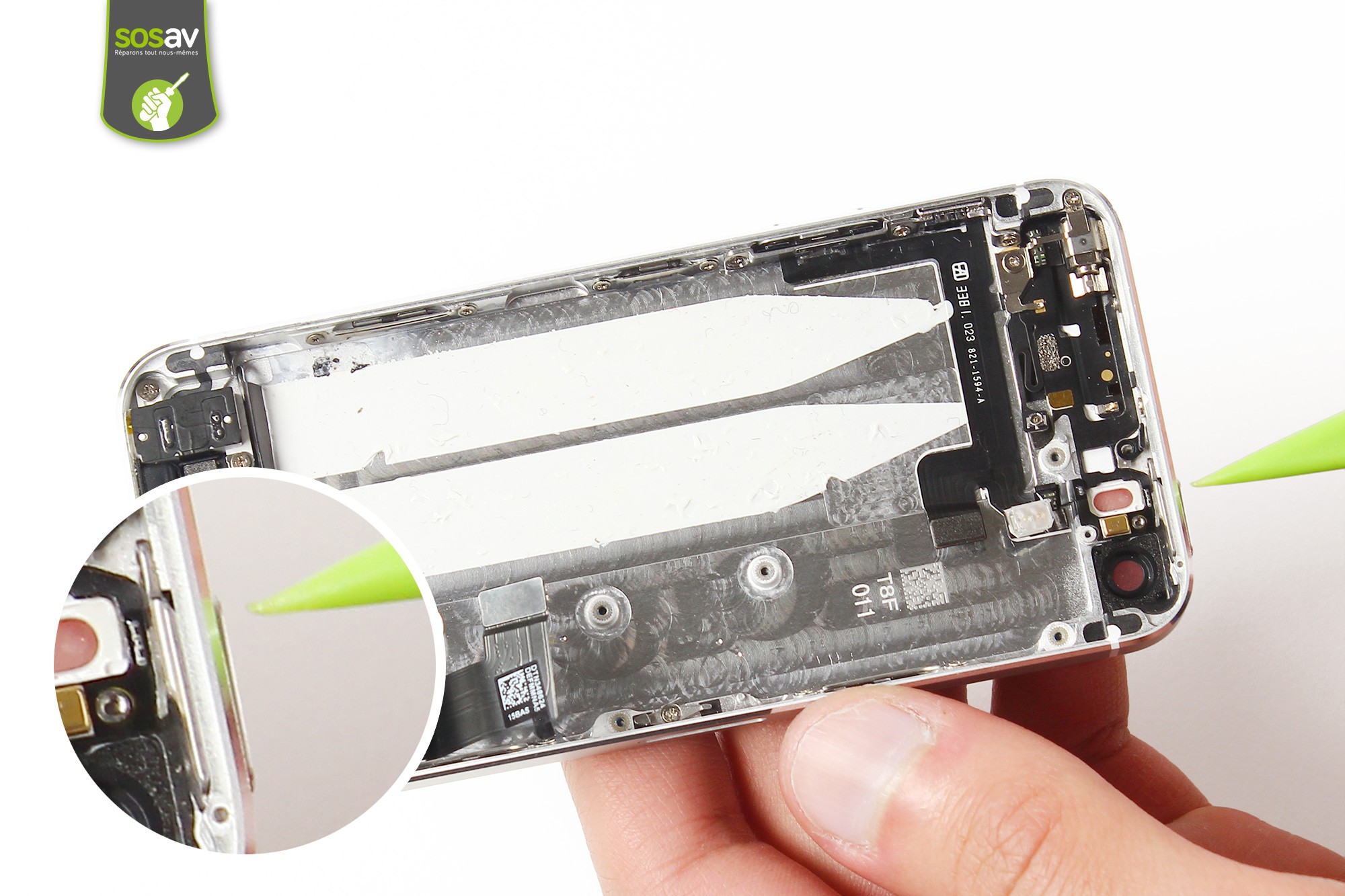 Utilisez la spatule en nylon afin de déconnecter les nappes suivantes : - Nappe de connexion de la batterie, - Nappe de connexion de la caméra arrière de votre iPhone 5S.