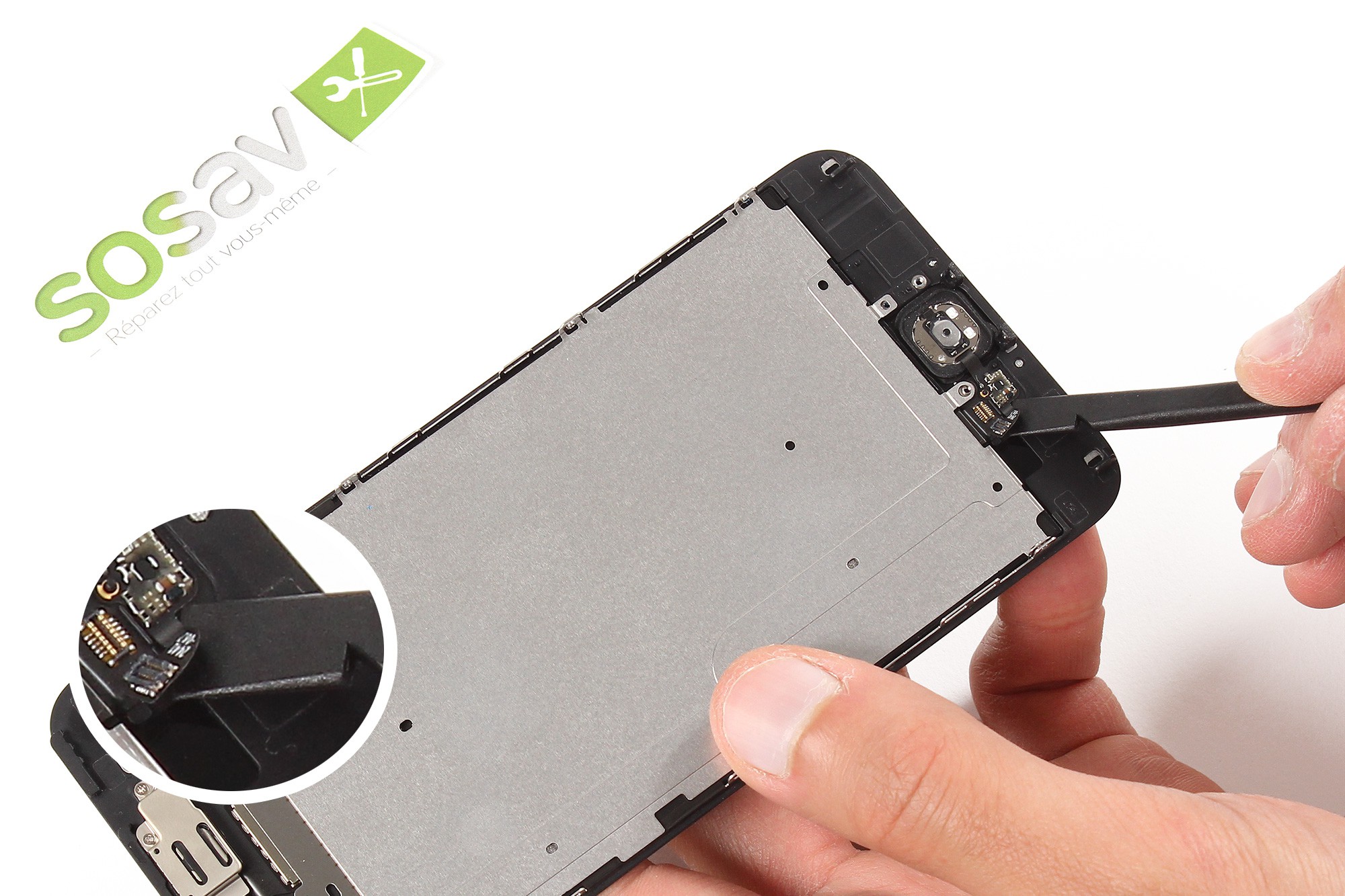 Toujours à l'aide de la spatule en nylon, déconnectez ensuite le connecteur du bouton home.