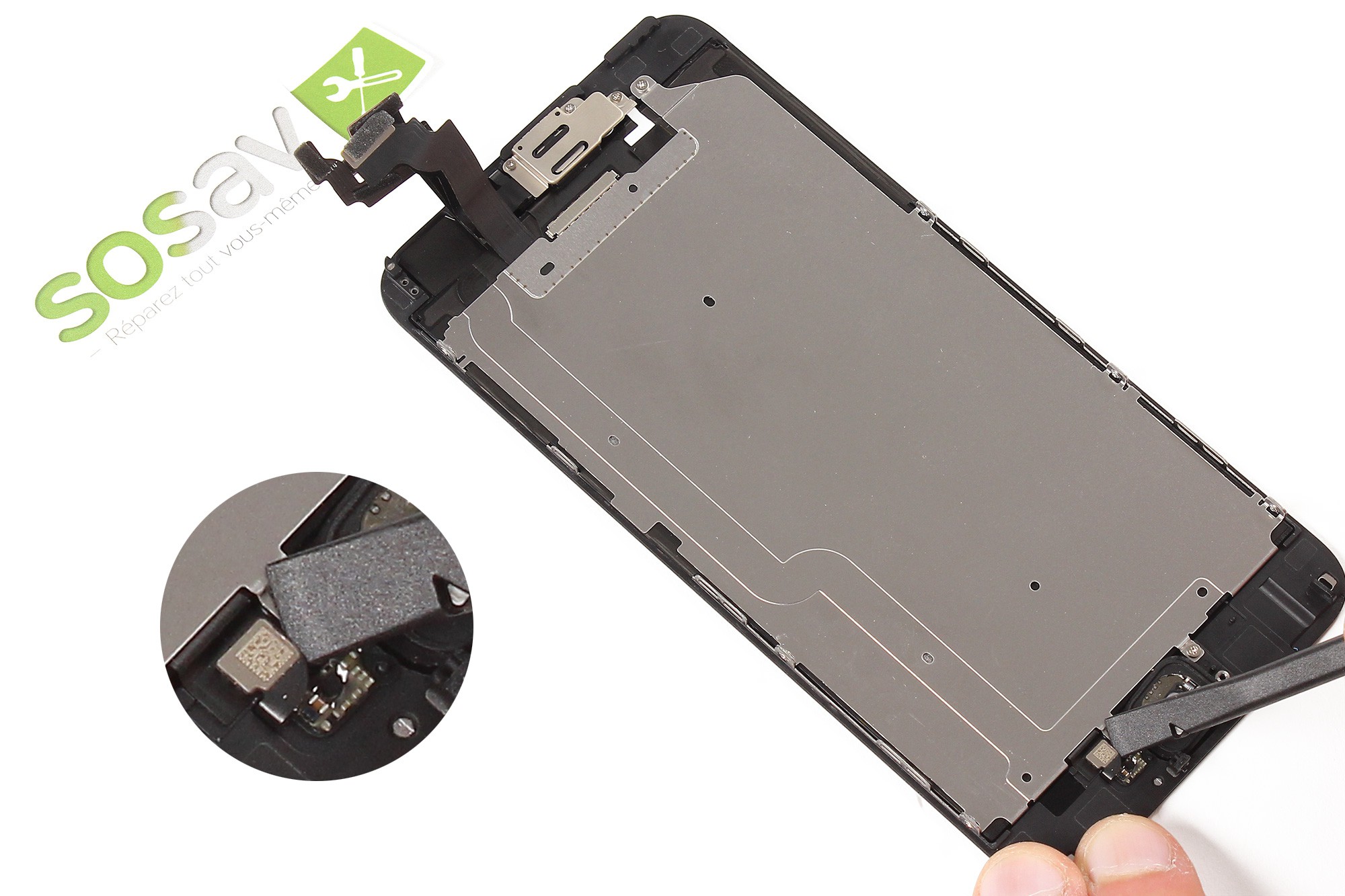 Réutilisez ensuite la spatule en nylon afin de décaler légèrement le connecteur lié au bouton home.