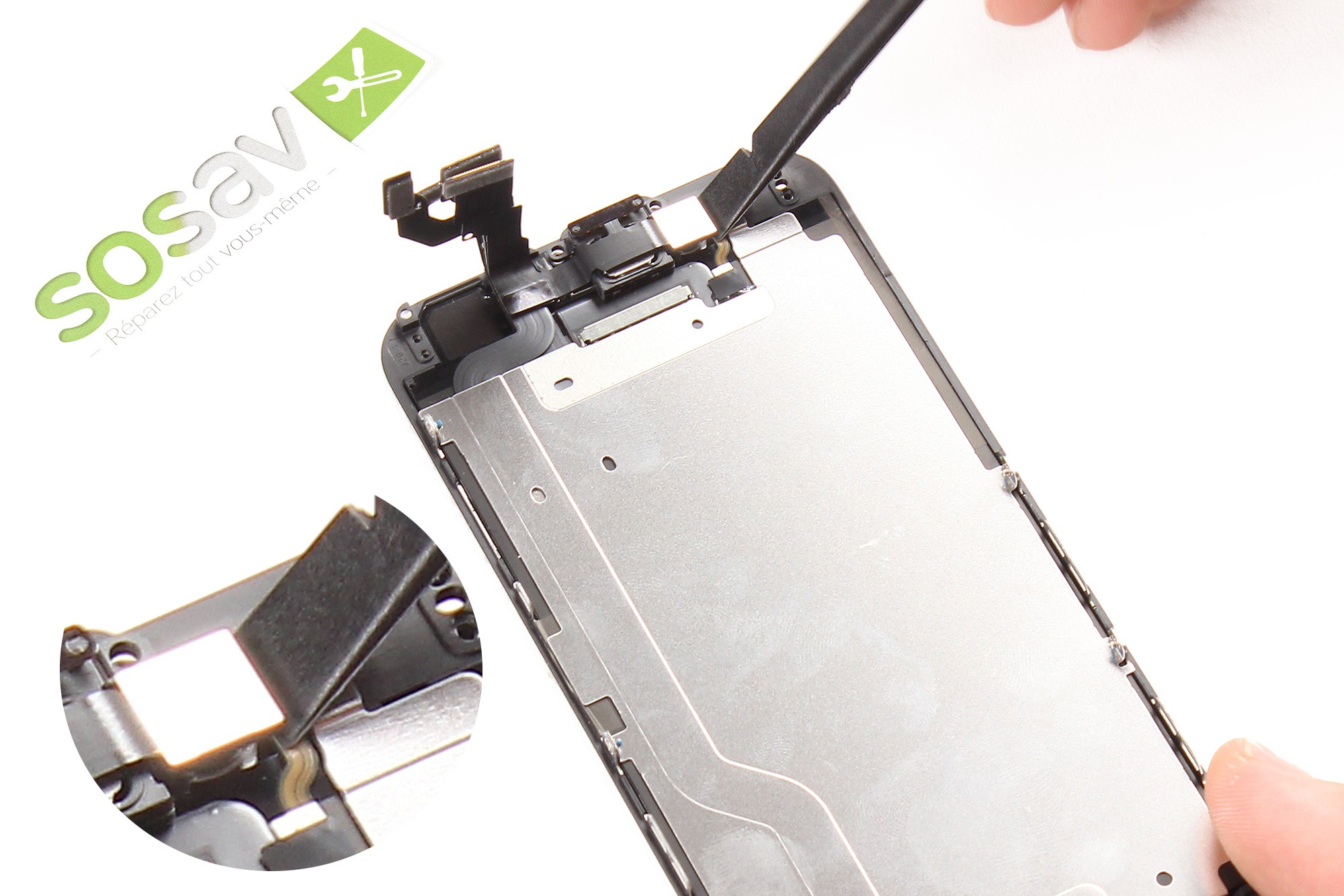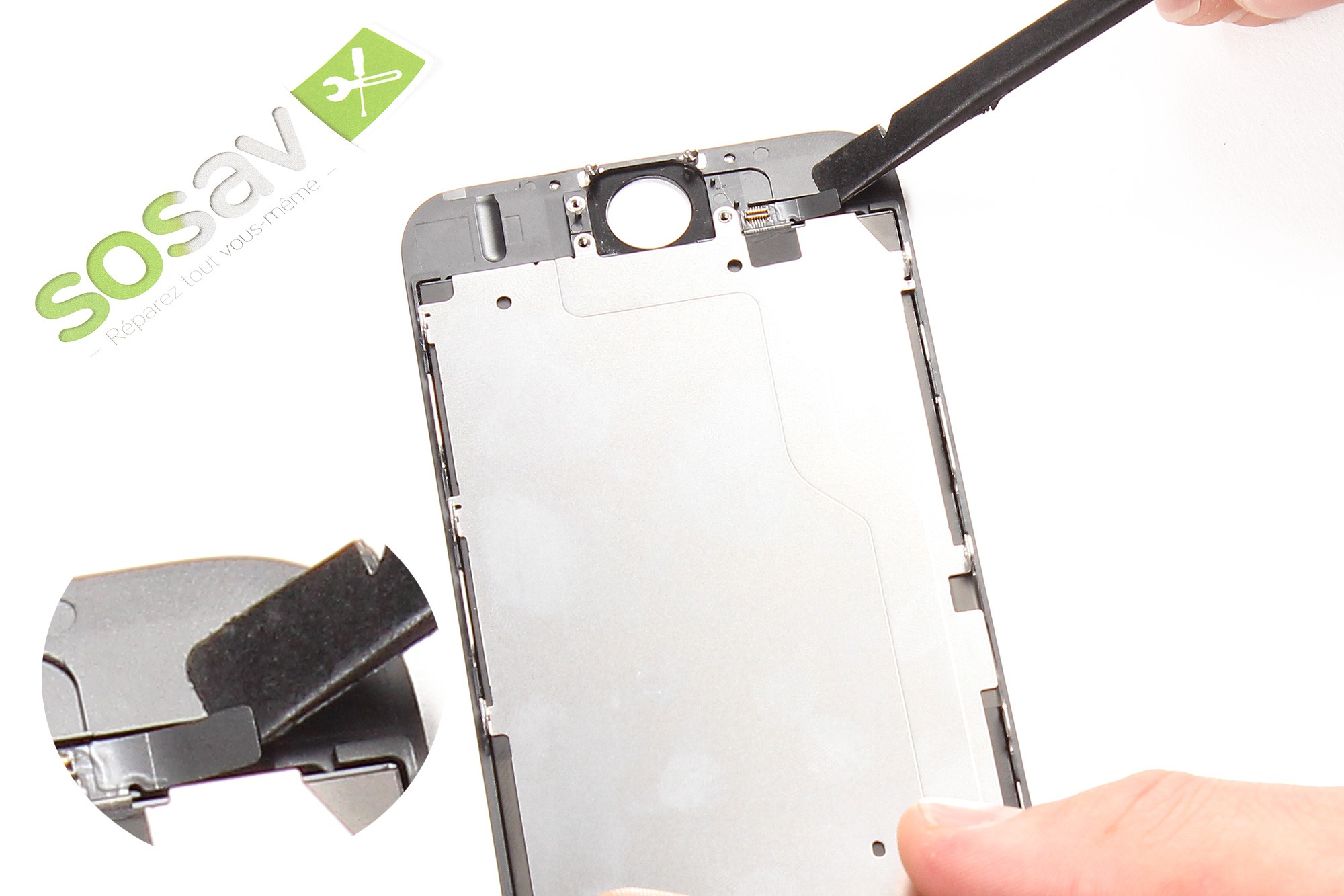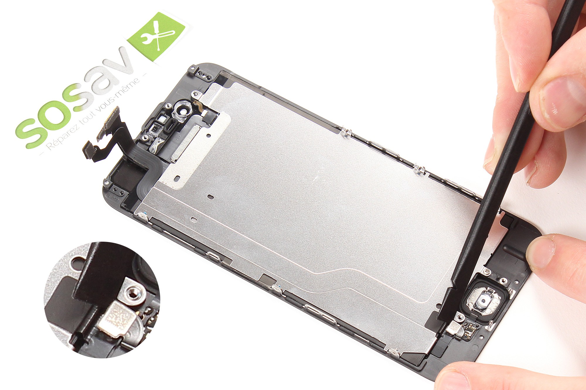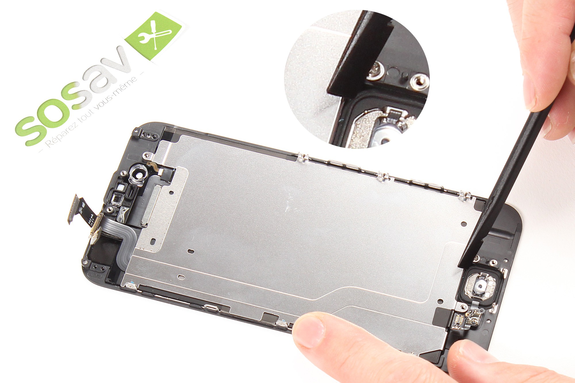 Servez-vous à nouveau de la spatule en nylon pour décoller délicatement la nappe de liaison du bouton home.