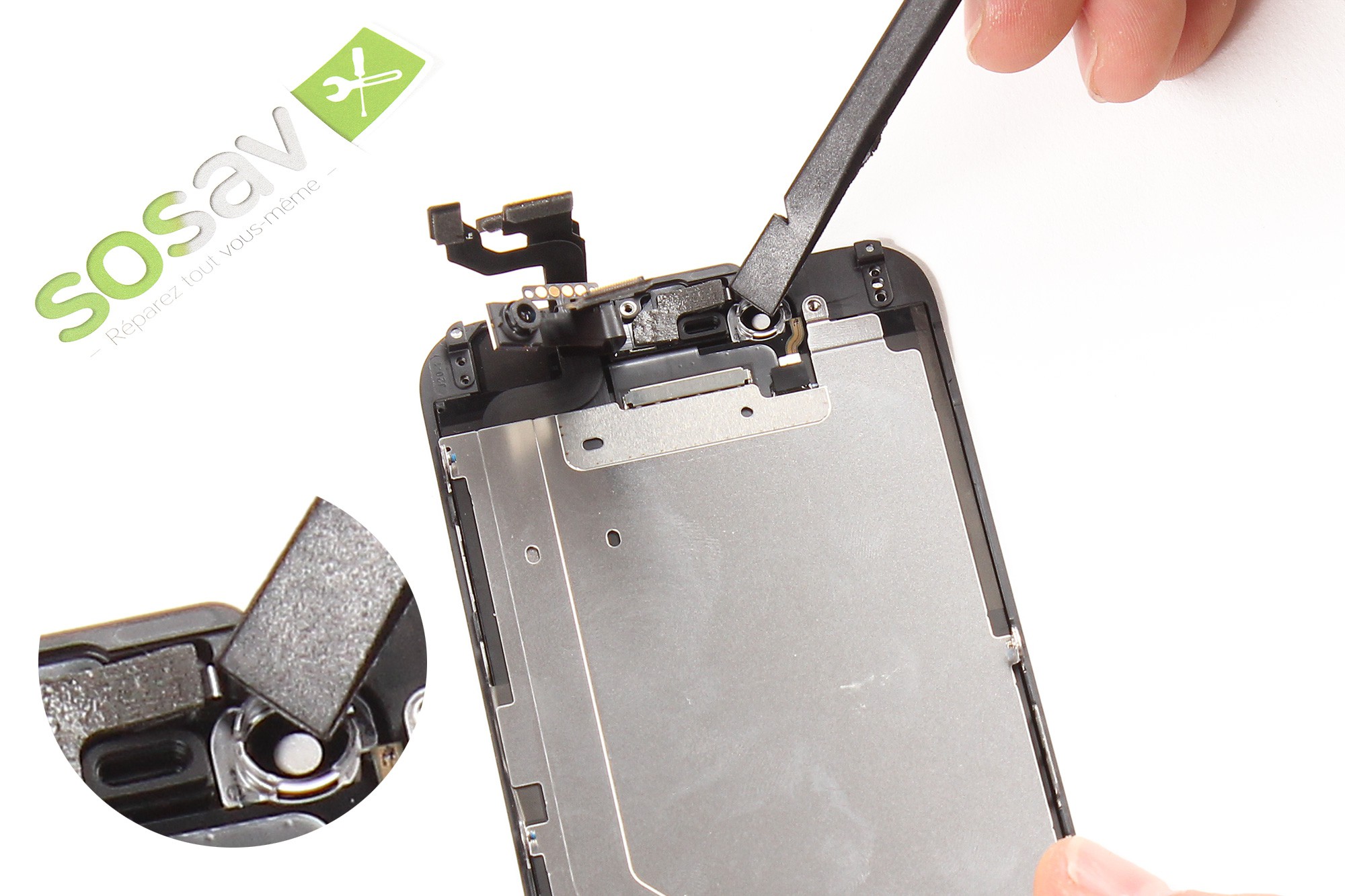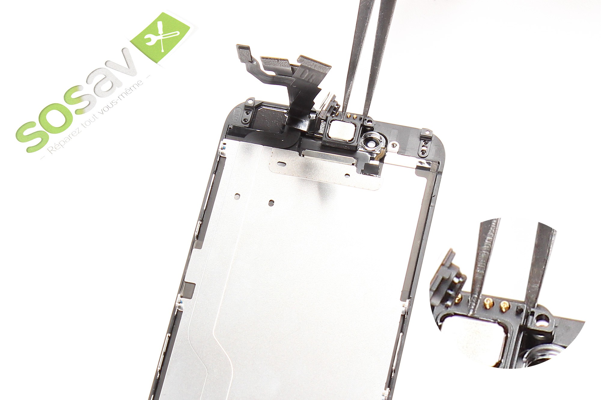 A l'aide de la pince, retirez ensuite l'élement métallique d'appui du haut-parleur interne (haut-parleur d'écoute).