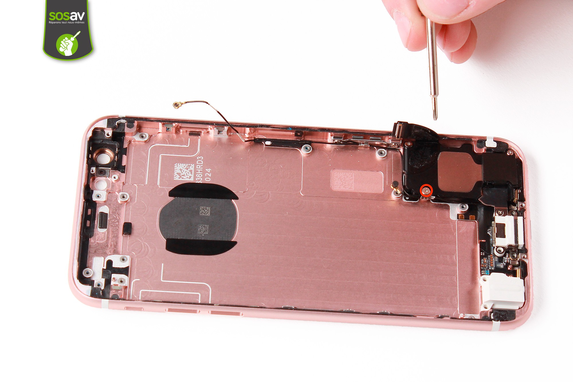 Utilisez le tournevis cruciforme afin de dévisser la vis entourée en rouge servant à maintenir l'antenne GSM au haut parleur.