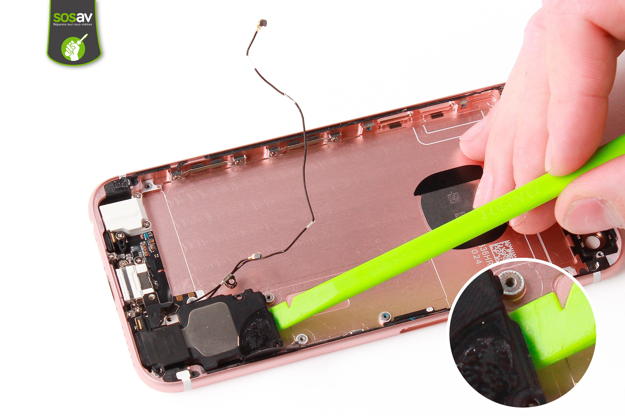 Insérez délicatement la spatule sous le haut-parleur externe afin de le soulever. Aucune résistance ne doit se faire sentir.Attention toutefois à la nappe du connecteur de charge qui se situe sous le haut-parleur.
