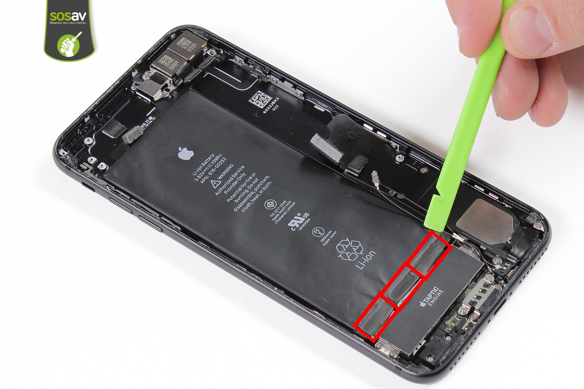 Trois adhésifs maintiennent la batterie.Ces adhésifs sont localisés en bas de la batterie, encadrés ci-contre en rouge.