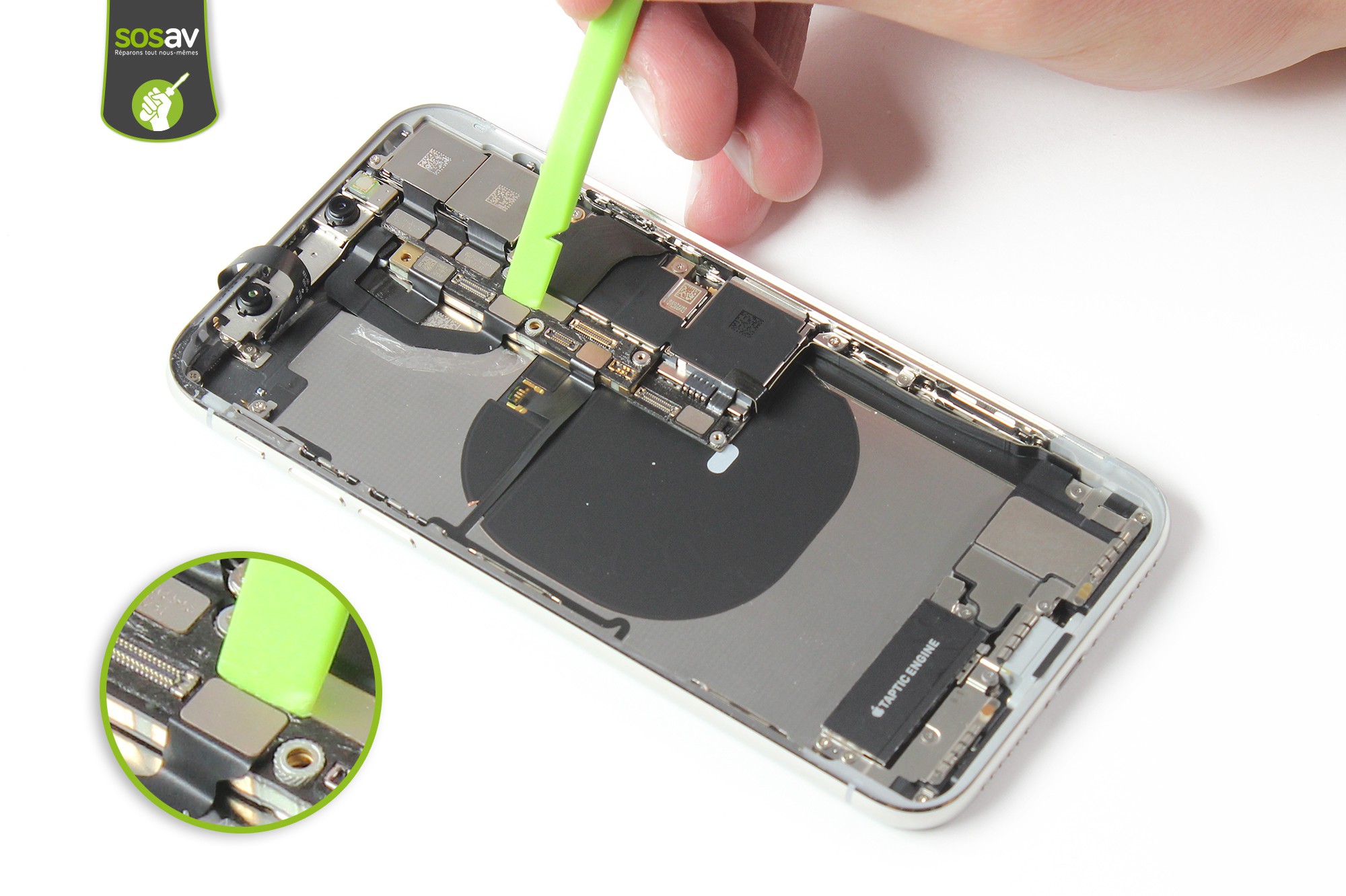 Toujours avec la spatule en nylon, déconnectez ensuite la nappe de la batterie.Cette étape est très importante et doit être respectée pour des raisons de sécurité !