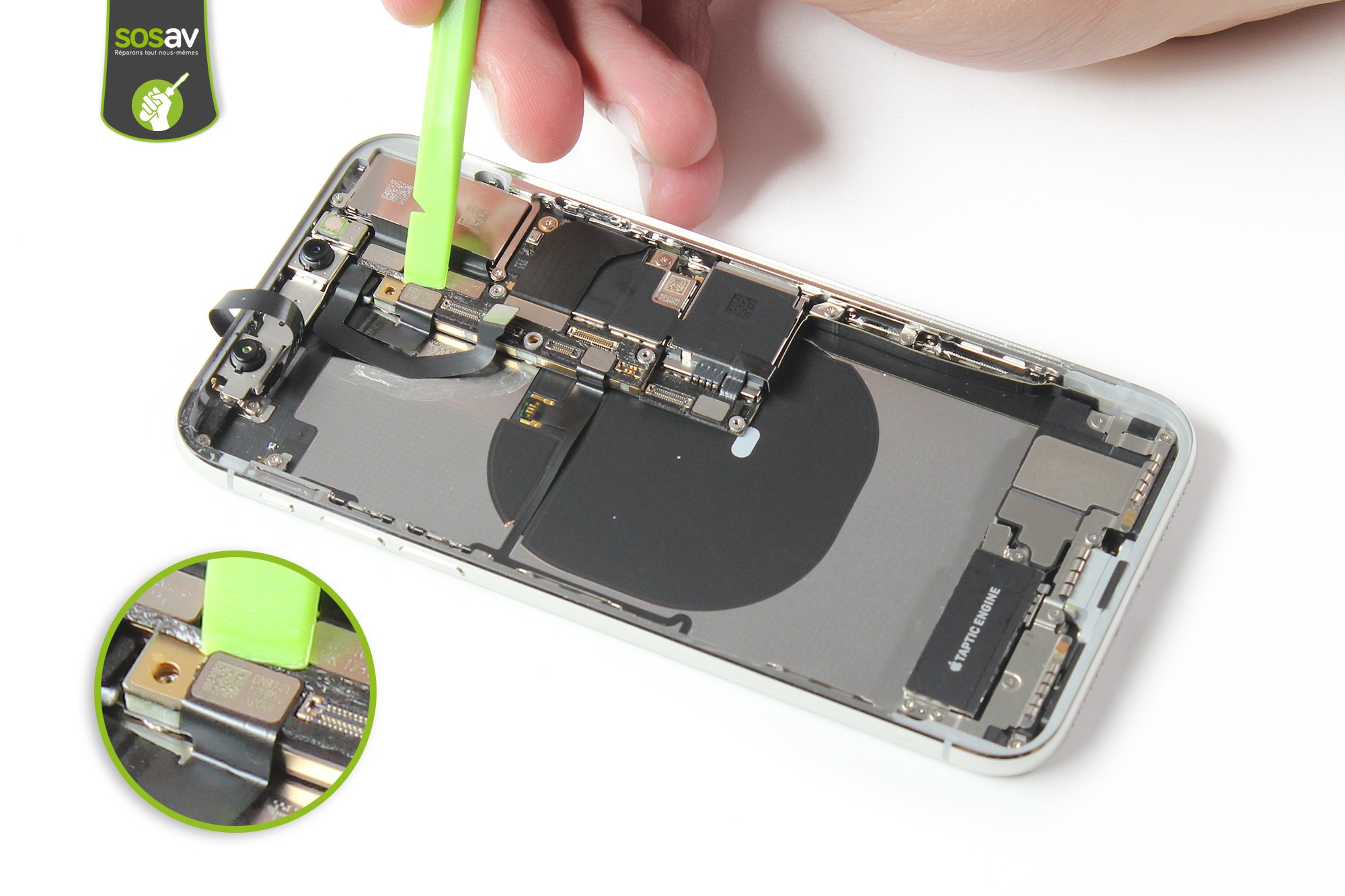 Trois nappes relient l'ensemble capteur face ID / caméra avant / projecteur infrarouge à la carte mère de l'iPhone X.A l'aide de la spatule en nylon, déconnectez la première nappe et décollez-la délicatement du châssis.