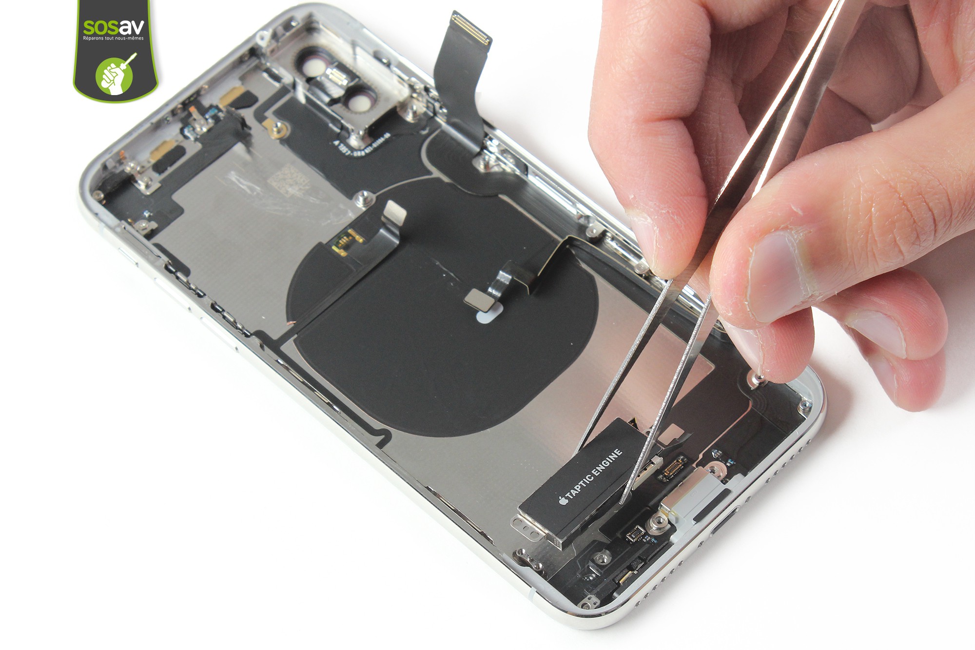 Les vibrations de cet iPhone X sont produites à l'aide du Taptic Engine. Petit composant placé à proximité du connecteur de charge et ayant fait son apparition avec l'iPhone 6S.Ce composant se retire aisément et sans mal avec notre pince chérie.