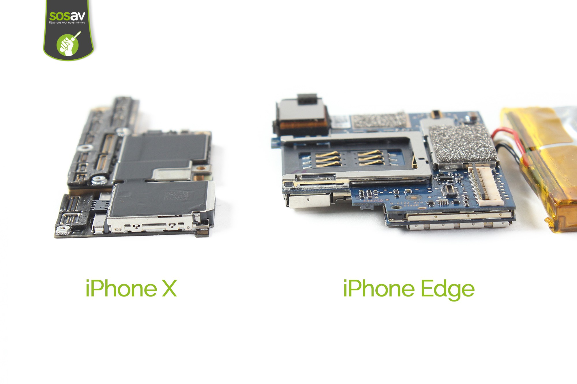 A titre de comparaison, nous avons spécialement ressorti l'iPhone EDGE (2007) de nos tiroirs.L'élément sur lequel nous avons trouvé le plus de similitudes demeure bien entendu... la carte mère ! Voici photo une comparaison simple des cartes mères iPhone EDGE et iPhone X.10 ans séparent les deux !