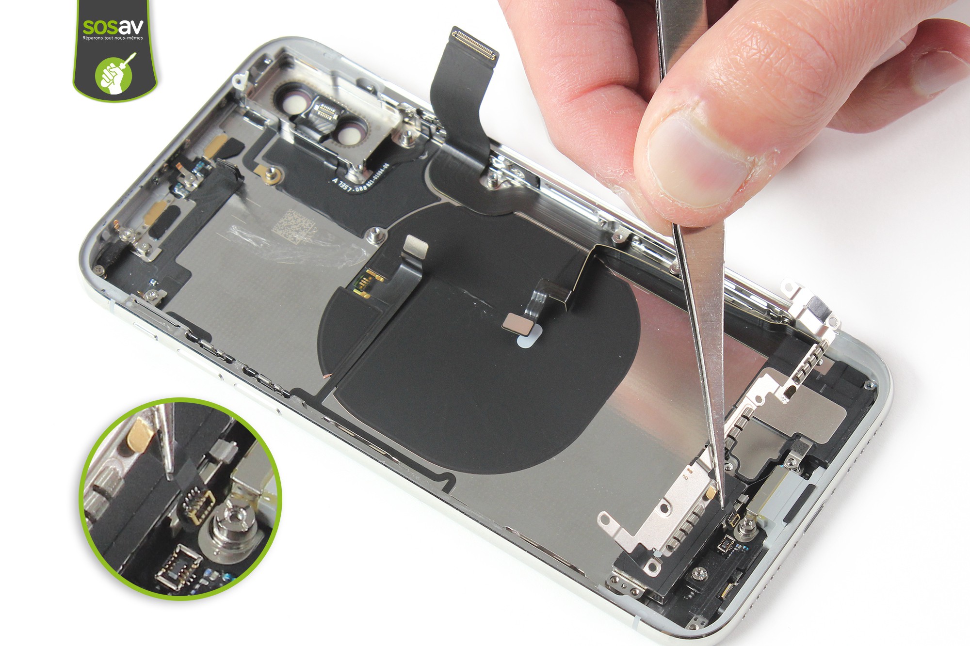 Passons maintenant aux boutons latéraux (volume, vibreur).Si la fixation de la nappe ne diffère guère des anciens iPhone, nous notons une nouveauté sur cet iPhone X à ce niveau : la nappe est soudée sur la nappe NFC !Cela signifie que pour remplacer la nappe NFC, il sera nécessaire de remplacer la nappe boutons de volume/vibreur.Et vice versa, comme dirait l'autre !