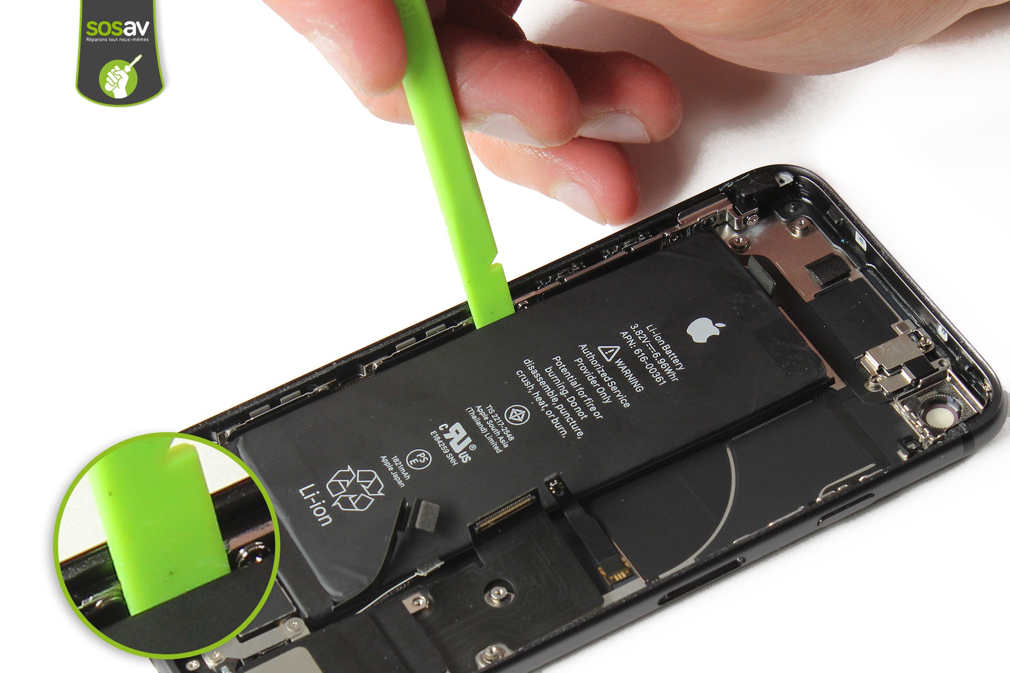 A l'aide de la spatule en nylon, faites délicatement levier sur la batterie afin de la retirer.